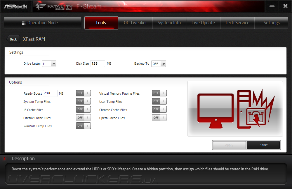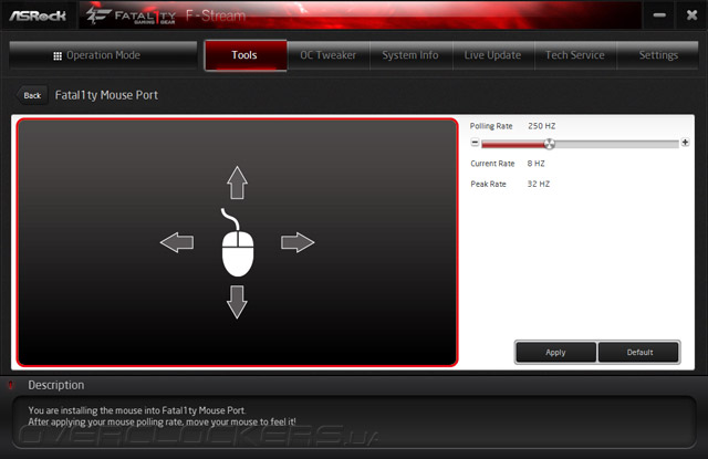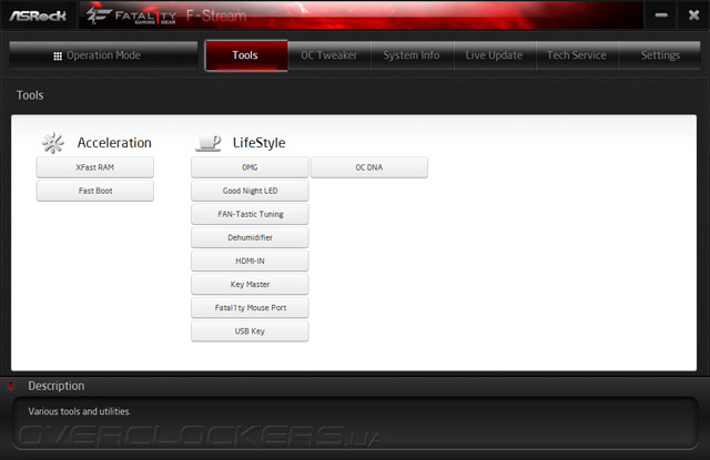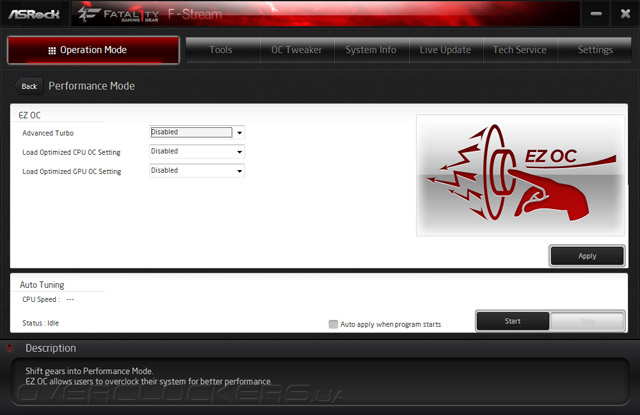 В комплекте поставки новинки имеется DVD-диск со всеми необходимыми драйверами и набором программного обеспечения. В то время для «обычных» материнских плат ASRock предлагается утилита A-Tuning, героиня сегодняшнего обзора комплектуется программным продуктом F-Stream Tuning. На самом деле, между этими двумя программами нет разницы за исключением оформления интерфейса. Как вы помните, в ранних версиях A-Tuning любое изменение параметров быстродействия вызывало ошибку, но производитель оперативно выпустил обновление, и в текущем релизе все заявленные возможности функционируют в штатном режиме. C помощью программы F-Stream Tuning пользователи могут включить режим пониженного энергопотребления, активировать автоматический разгон, либо задать параметры быстродействия вручную.