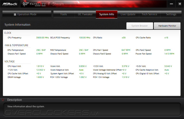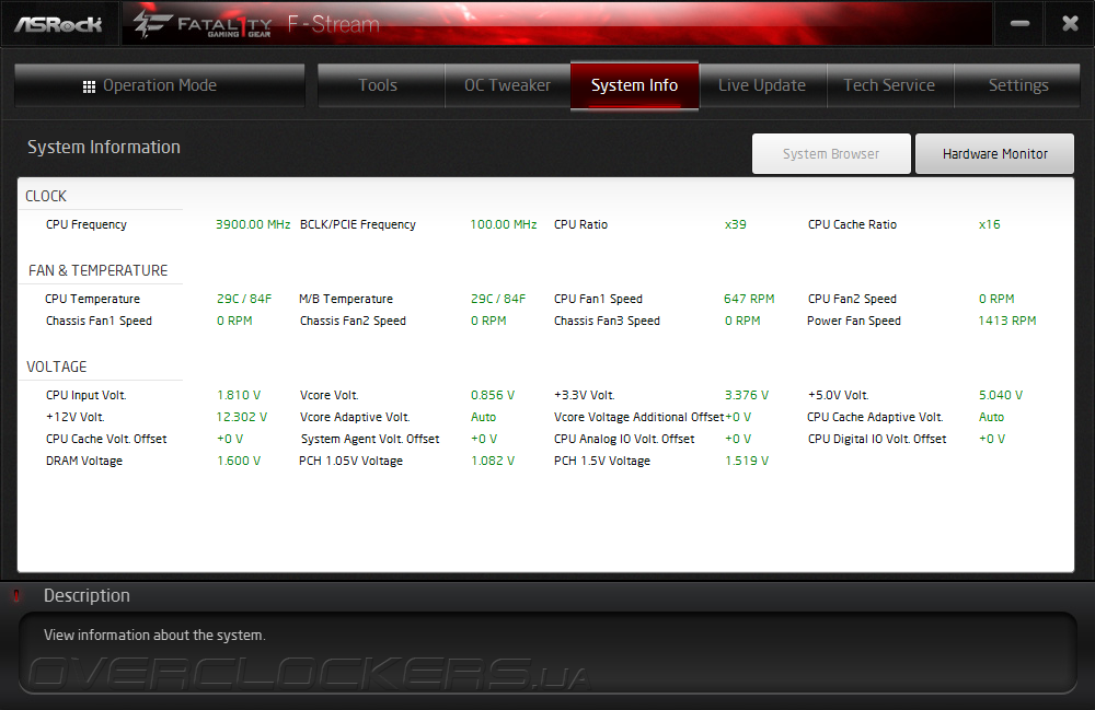 Также, среди функций программного обеспечения значится отображение текущего режима быстродействия и показаний аппаратного мониторинга, для этого служит раздел System Info. Во вкладке System Browser пользователи могут получить подробную информацию об установленных устройствах.