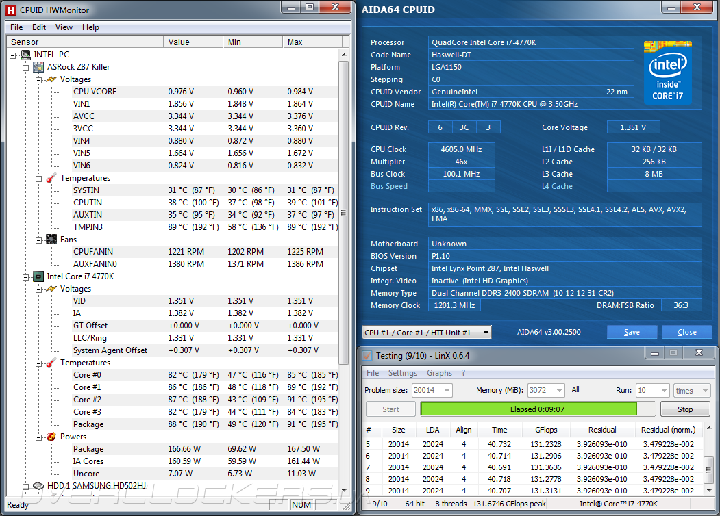 Также, мы проверили разгон нашего Core i7-4770K на ASRock Fatal1ty Z87 Killer. Эксперимент не преподнес сюрпризов, процессор совершенно стабильно функционировал на частоте 4600 МГц с напряжением 1,35 В, демонстрируя приемлемые температуры при охлаждении мощным воздушным кулером Thermalright Silver Arrow. Модули ОЗУ работали в режиме 2400 МГц с задержками 10-12-12-31 в полном соответствии с профилем Х.М.Р., а Uncore-часть центрального процессора функционировала на частоте 4300 МГц при напряжении 1,25 В.