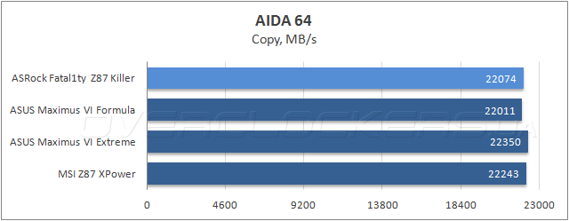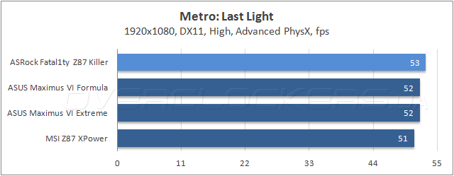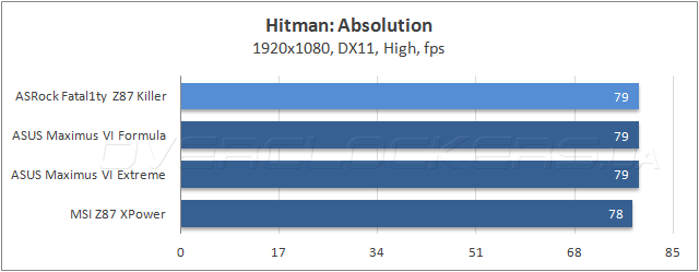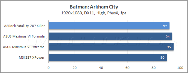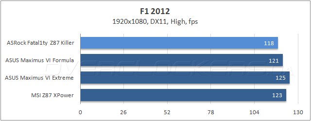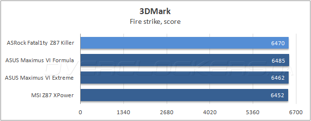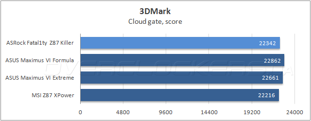 В тестовом сценарии Cloud gate из состава игрового бенчмарка 3DMark общий балл героини сегодняшнего обзора в точности соответствует достижениям «материнки» MSI, с которой Fatal1ty Z87 Killer разделила третье место. Зато, в более сложном Fire strike все четыре участницы показали идентичные результаты. Похоже, «сырая» прошивка системной платы ASRock не позволяет её показать максимальные результаты в процессорозависимых тестах.