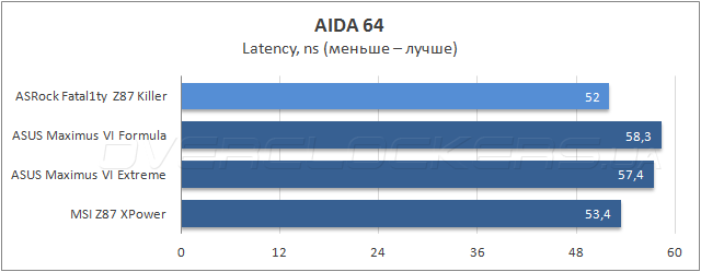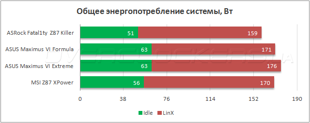 По части экономного расходования электроэнергии ASRock Fatal1ty Z87 Killer уверенно опередила соперниц. Скорее всего, секрет энергоэффективности кроется в простоте конструкции и минимальном использовании дополнительных контроллеров, которые могут вносить свой вклад в «аппетиты» материнских плат.