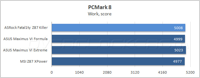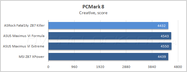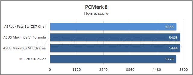 В полусинтетическом тестовом приложении Futuremark PCMark 8, которое отражает производительность при выполнении типичных прикладных задач, Fatal1ty Z87 Killer показала результаты наравне с MSI Z87 XPower. Вместе они немного уступили системным платам ASUS в подтестах Home и Creative, но отставание так невелико, что вряд ли будет заметно в повседневной работе.