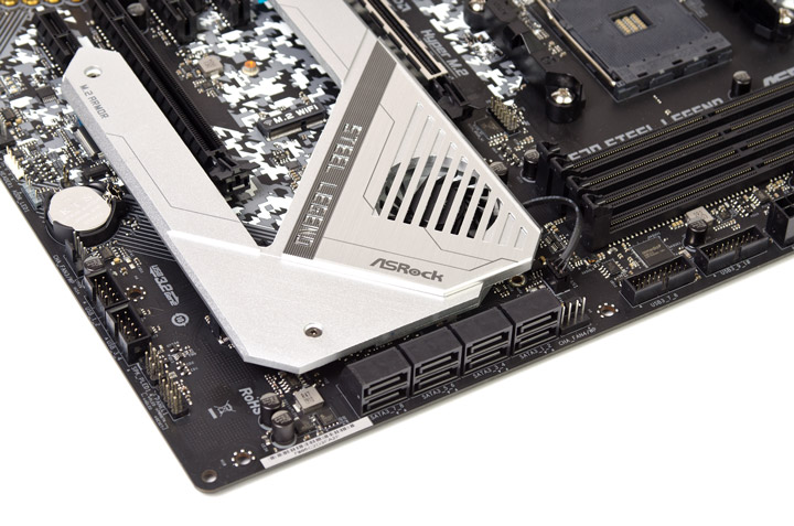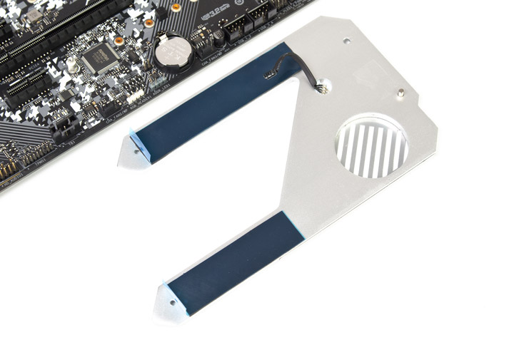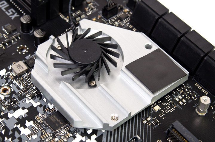 Её контакт с выделенным радиатором под X570 происходит при участии весьма цепкой термопрокладки, отделить части друг от друга будет непросто. Трудностей создаст и четырёхпроводный кабель для нужд подсветки, ведущий от платы к ней. Вентилятор же использует трёхпроводное подключение. Охлаждающая чип болванка слабо похожа на радиатор, воздух будет двигаться как вверх, к слотам памяти, так и вниз, обдувая буквальным образом лишь пару рёбер; вместе с двумя стенками получим три условных вентиляционных канала.