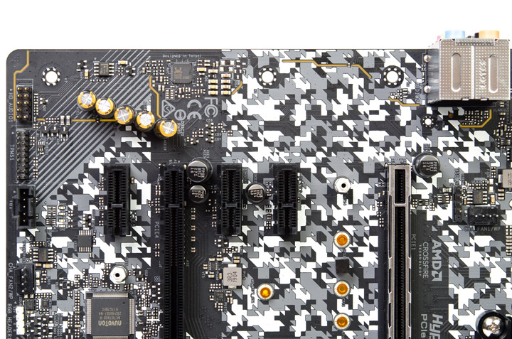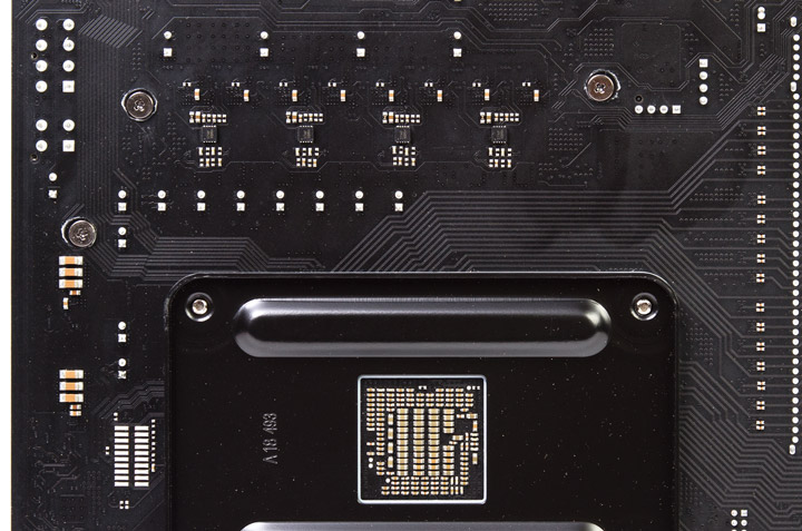 Ближе к сокету заготовлена дополнительная площадка на четыре контакта для выхода USB от кулера ЦП, её при остром желании можно использовать и для других целей. Организация делений 16 линий PCI-E в этой модели отсутствует, все они сразу подведены к экранированному слоту. Поэтому оставшиеся четыре элемента связаны с хабом.