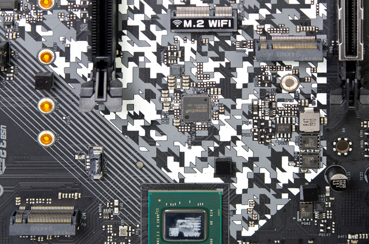 Концентратор линий PCI-E, работающий как свитч, немного неожиданно обнаружился рядом с хабом, хотя тот располагает огромным числом линий. Вероятнее всего, он необходим для посадочной площадки M.2 Key E и без установленного адаптера будет бездействовать.