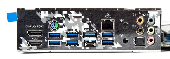 Порты на задней панели обеспечивают все ожидания от платы подобного уровня, есть: два видеовыхода, разного рода USB, позолоченные аудиогнёзда, S/PDIF. Два отверстия под антенные выходы выступают в качестве заготовки под возможное расширение конфигурации ПК. Демонтаж пластины проводится путём выкручивания пары винтов с обратной стороны устройства.