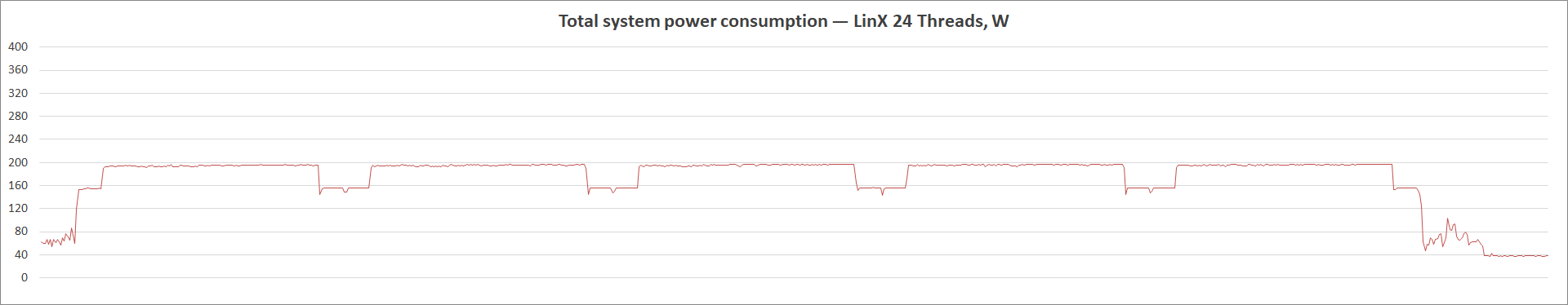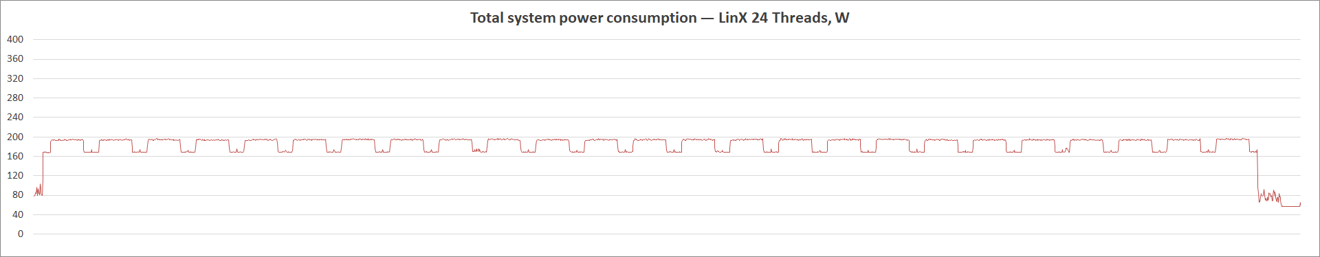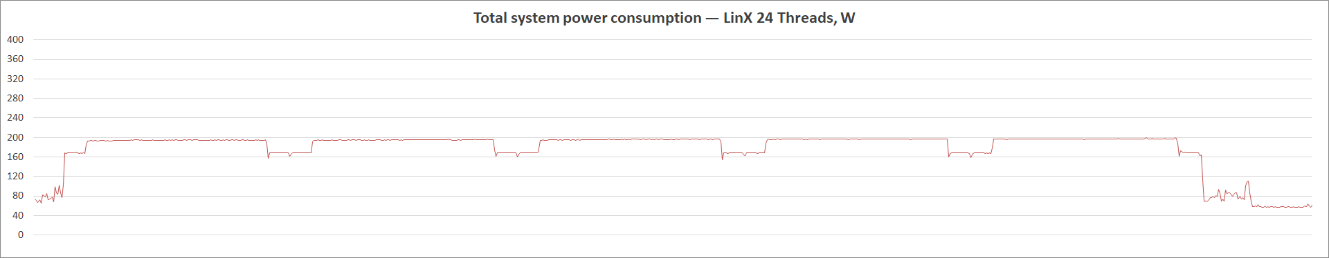 В простое потребление понижалось до 37 Вт, что является отличным показателем, при нагрузке росло вплоть до 197 Вт, а это уже вдалеке от рекордов эффективности.