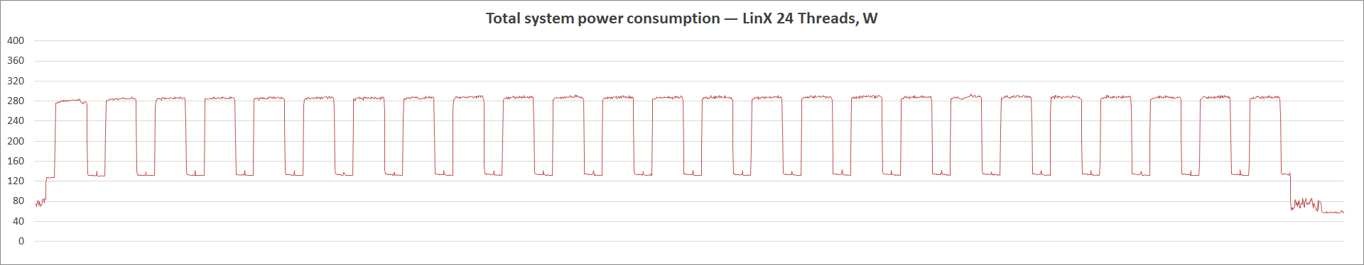 Оцените рост потребления энергии в простое ПК — 57 Вт! Отладка буквально напрашивается. Максимальная же величина равнялась 199 Вт. А вот тут ничего крамольного не произошло — такой же ограниченный рост был на ряде более престижных устройств.