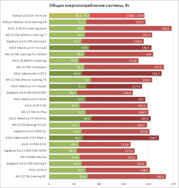 Замеры выполнялись после прохождения всех прочих тестов в «устоявшемся» режиме компьютера при помощи прибора собственной разработки. Методика заключалась в фиксации средневзвешенного значения потребления тестового стенда «от розетки» во время прохождения теста Prime95 с применением профиля In-place large FFTs а также при простое компьютера после завершения теста.