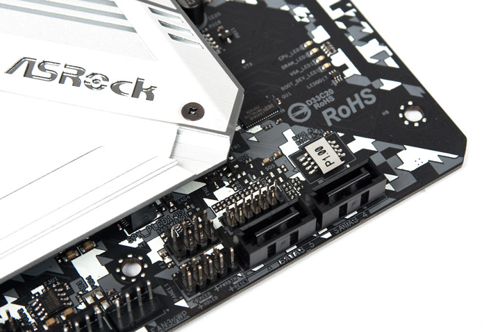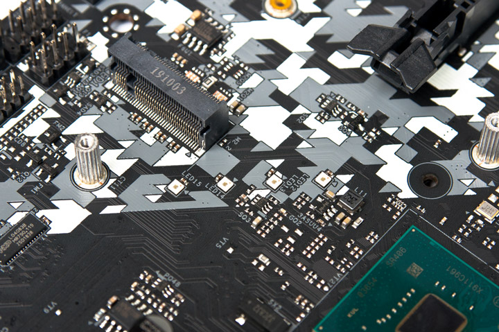 Как уже говорилось прежде, нижний слот M.2 обладает составным предустановленным охладителем. Есть ограничение по длине, предельная здесь — восемь сантиметров. На самом большом охладителе есть две разные термопрокладки — для накопителя и под соединение с радиатором PCH. Между ними оформлено «окно» со светорассеивающей плёнкой, оно обеспечивает сочную иллюминацию для эмблемы. Чтобы не было проблем с монтажом, предусмотрительно инженерами было заготовлено два направляющих штыря.