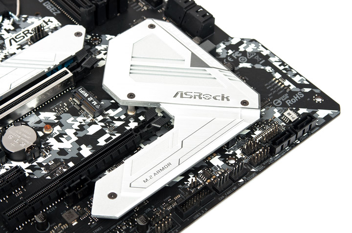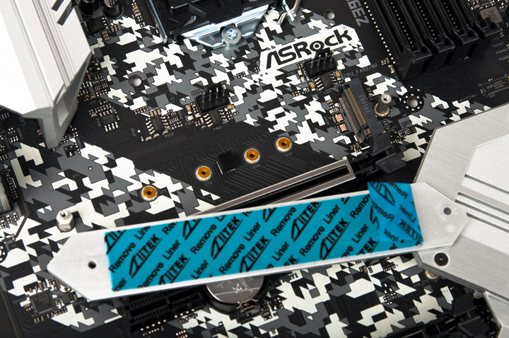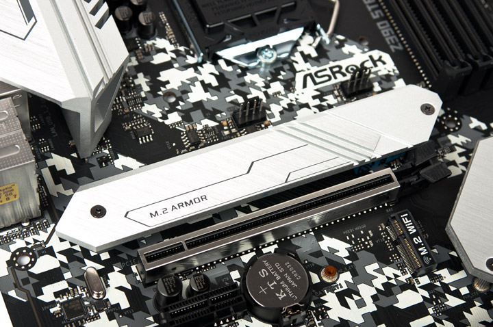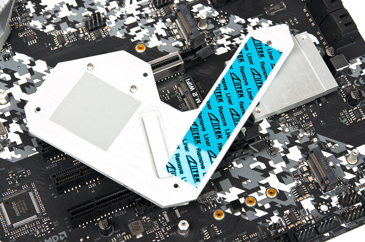 Верхний M.2 предназначен для накопителей всех типов и габаритов. Предустановленный охладитель имеет преднанесённый тепловой интерфейс.