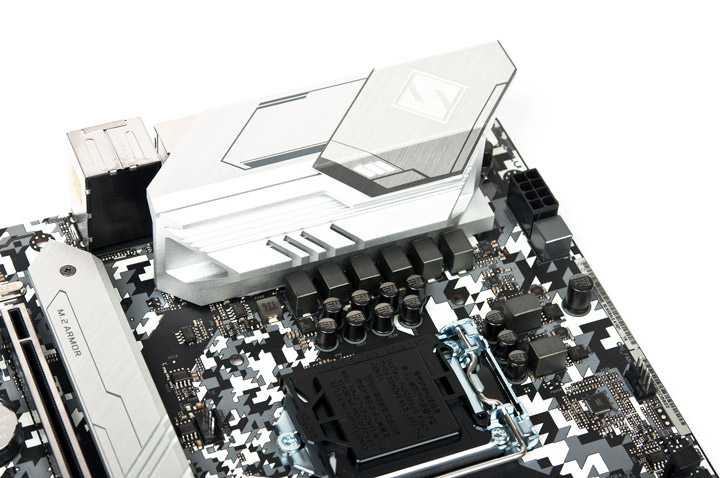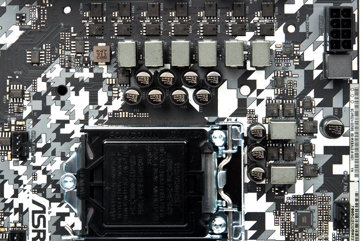 В отличии от нескольких предыдущих устройств от ASRock, посетивших наш тестовый стенд, включённые в состав Z390 Steel Legend термопрокладки имеют привычный, серый оттенок (а не жёлтый). Нет замечаний к аккуратности их нанесения, все транзисторы оказались накрытыми как положено. Надёжная фиксация была обеспечена винтовым прижимом.
