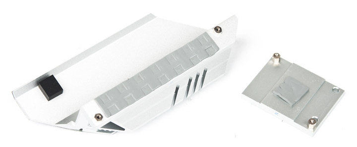 Микросхеме досталась простейшая по своему исполнению металлическая болванка, отдающая тепло дальше вверх, для чего используется даже отдельная термопрокладка большой площади (она будет видна дальше).