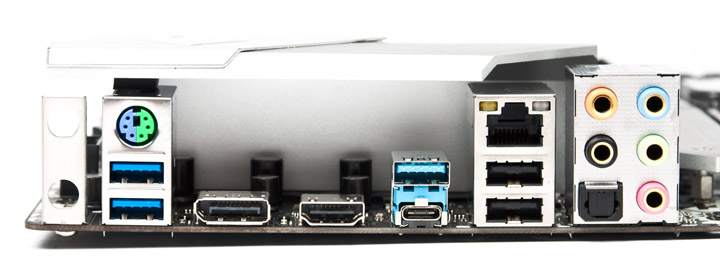 Над задней панелью не возвышается набивший оскомину пластиковый «навес». Вместо него используется радиатор VRM увеличенных размеров, его верхний ярус вытянут в сторону. Форма достаточно сложная, но с нашим двухсекционным кулером никаких проблем совместимости не возникло (как это уже бывало с платами, особенно небольших габаритов).