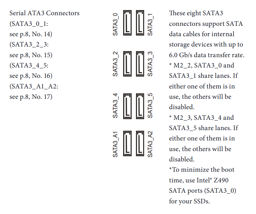 | Serial ATA | 6 x SATA 6 Гбит/с (Z490) 2 x SATA 6 Гбит/с (ASM1061) |