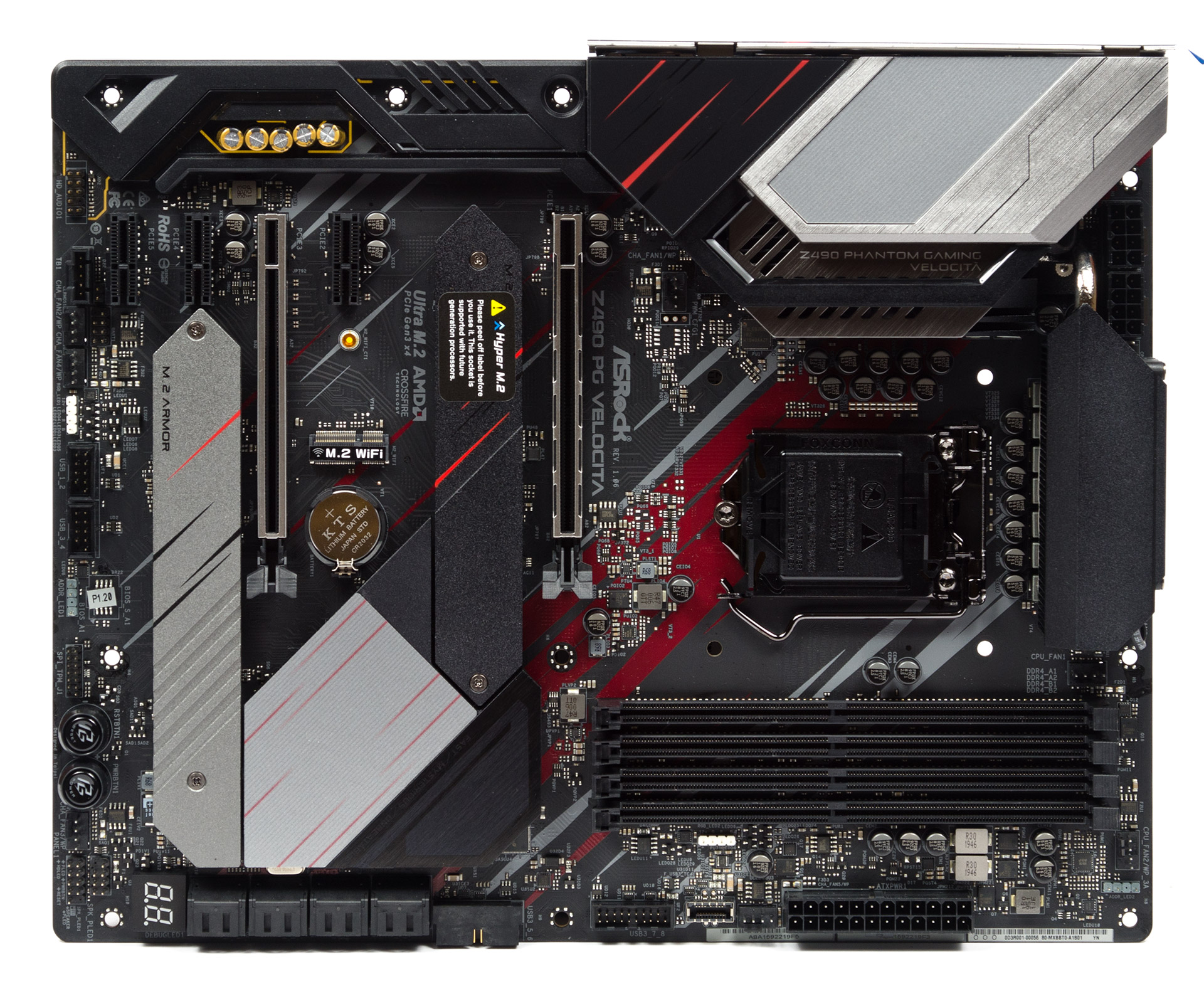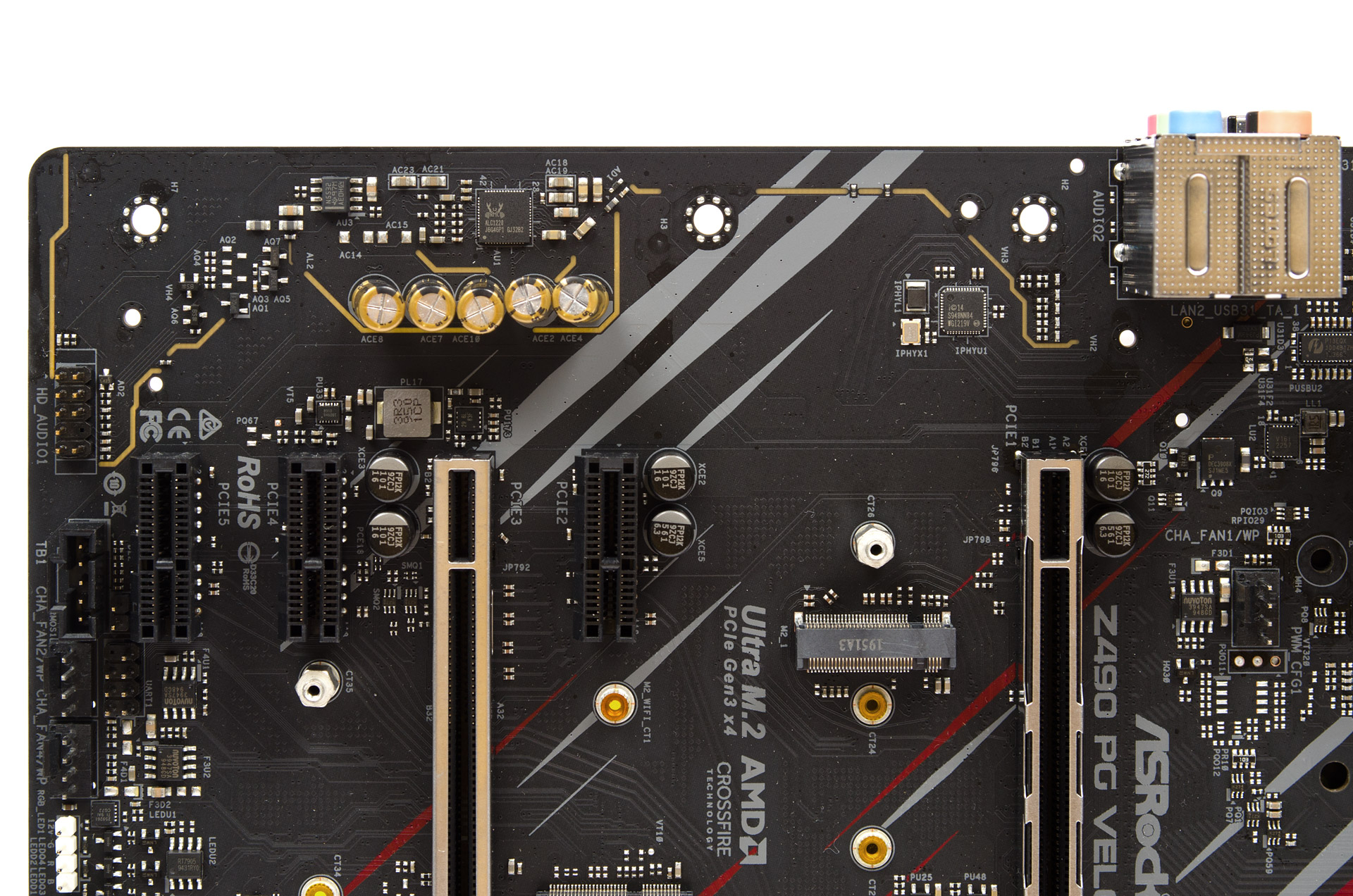 Штаб специалистов ASRock не перестаёт идти на смелые эксперименты, регулярно оснащая продукты чертами, отсутствующими у конкурентов. Процессоры Rocket Lake-S ещё находятся в разработке, а здесь уже предусмотрели специализированный порт M.2 для нужд скоростных SSD с интерфейсом PCI Express 4.0. Работать с нынешними ЦП поколения Comet Lake-S он не будет, но напротив него есть слот, связанный с чипсетом Intel Z490.