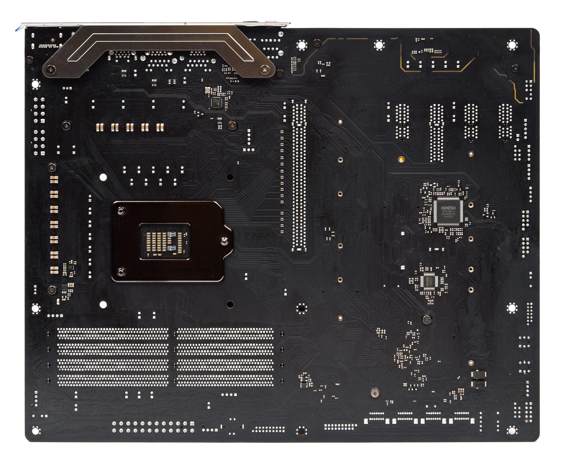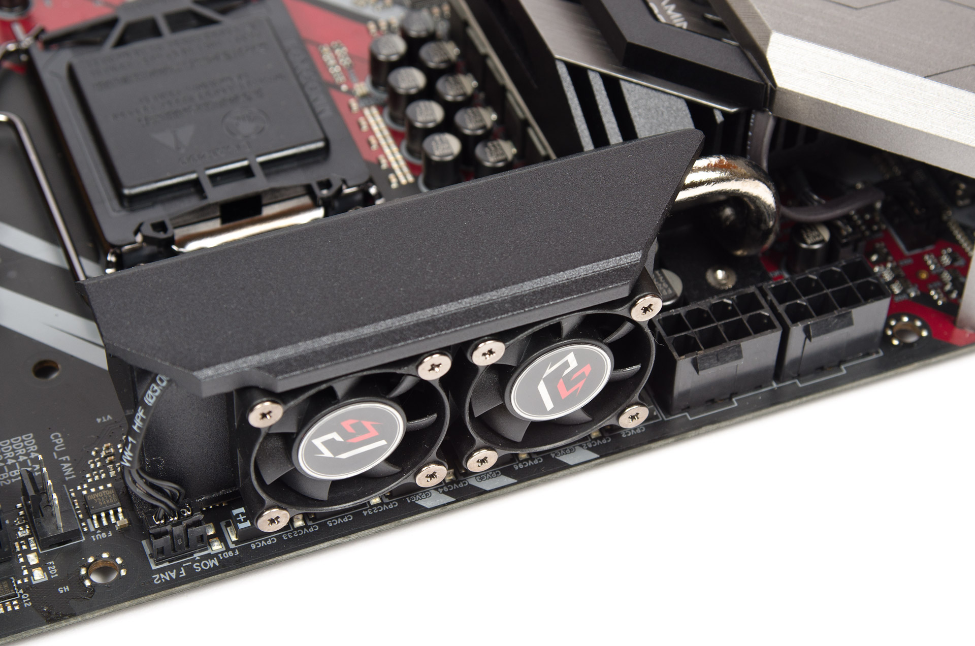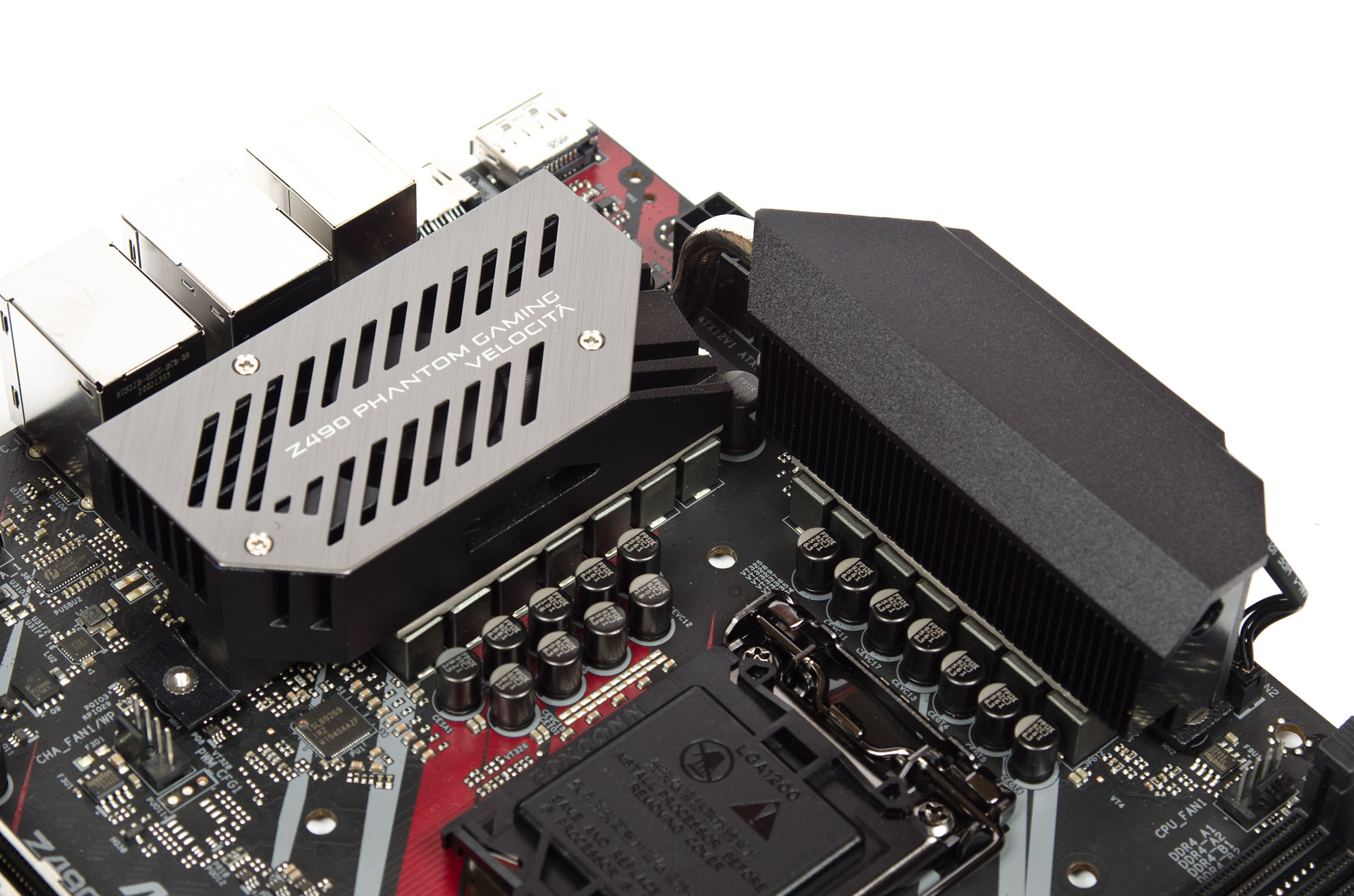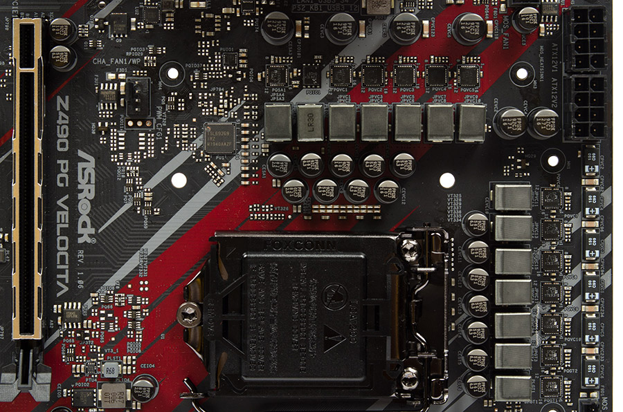 ШИМ-котроллер — ISL69269 от Renesas Electronics. Ввиду недоступности официальной документации, о его возможностях приходится догадываться. Ряд источников склоняется к поддержке реальных двенадцати (!) фаз. Учитывая наличие 68 выходов, это не выглядит чем-то малореальным. А всё дело в изменении политики Intel в обеспечении питания текущих (Comet Lake-S) и будущих (Rocket Lake-S) процессоров. Уже здесь напряжение SA подвязано на этот, основной ШИМ-контроллер, присоединившись к CPU и iGPU, другими словами, общее число контролируемых им параметров достигло трёх. Также планируется переход к обязательным двум каналам напряжения IO, но здесь всё ещё реализована традиционная одна фаза. Производитель не поскупился и все элементы промаркировал согласно их предназначению, потому кривотолки исключены. Имеем: один канал SA, десять под напряжение CPU и два для работы iGPU. Последняя пара сопровождается удвоителем фаз ISL6617A (PWM Doubler), распаянным сзади. Таким образом, вполне разумно допускать наличие истинных двенадцати фаз, что приводит нас к максимальной реализации возможностей ШИМ-контроллера. Одиннадцать SiC632A — основа для напряжений SA и CPU, два SiC654 распаяны под нужды iGPU; это продукция Vishay Intertechnology. За работу напряжения IO будет отвечать отдельный, скромный по размерам, однофазный ШИМ-контроллер APW8828 от Anpec Electronics Corporation. Соответствующая сборка — SM7341EHKP производства Sinopower. Твердотельные конденсаторы с увеличенным до 12 тысяч часов ресурсом работы на предельных температурах, также есть немалое число танталовых, размещённых с обеих сторон устройства. Словом, над проектировкой VRM изрядно потрудились, ничего подобного нами раньше не встречалось.