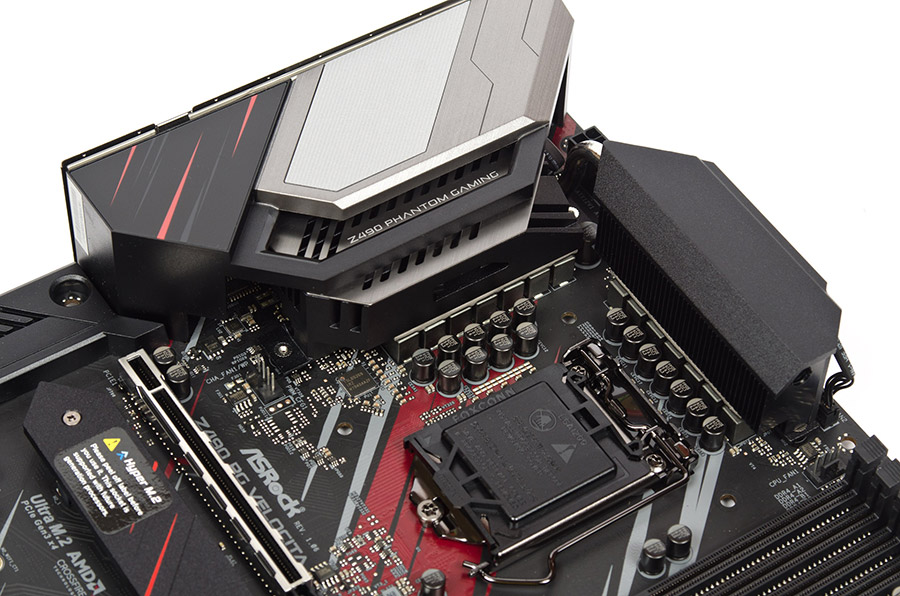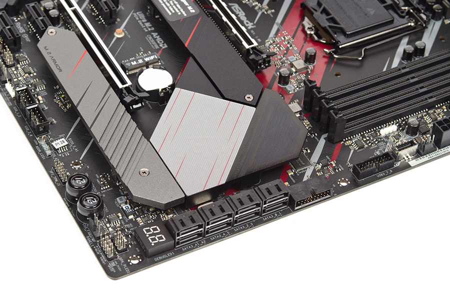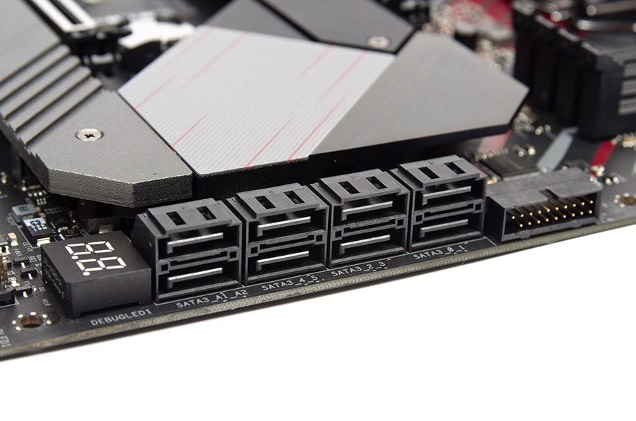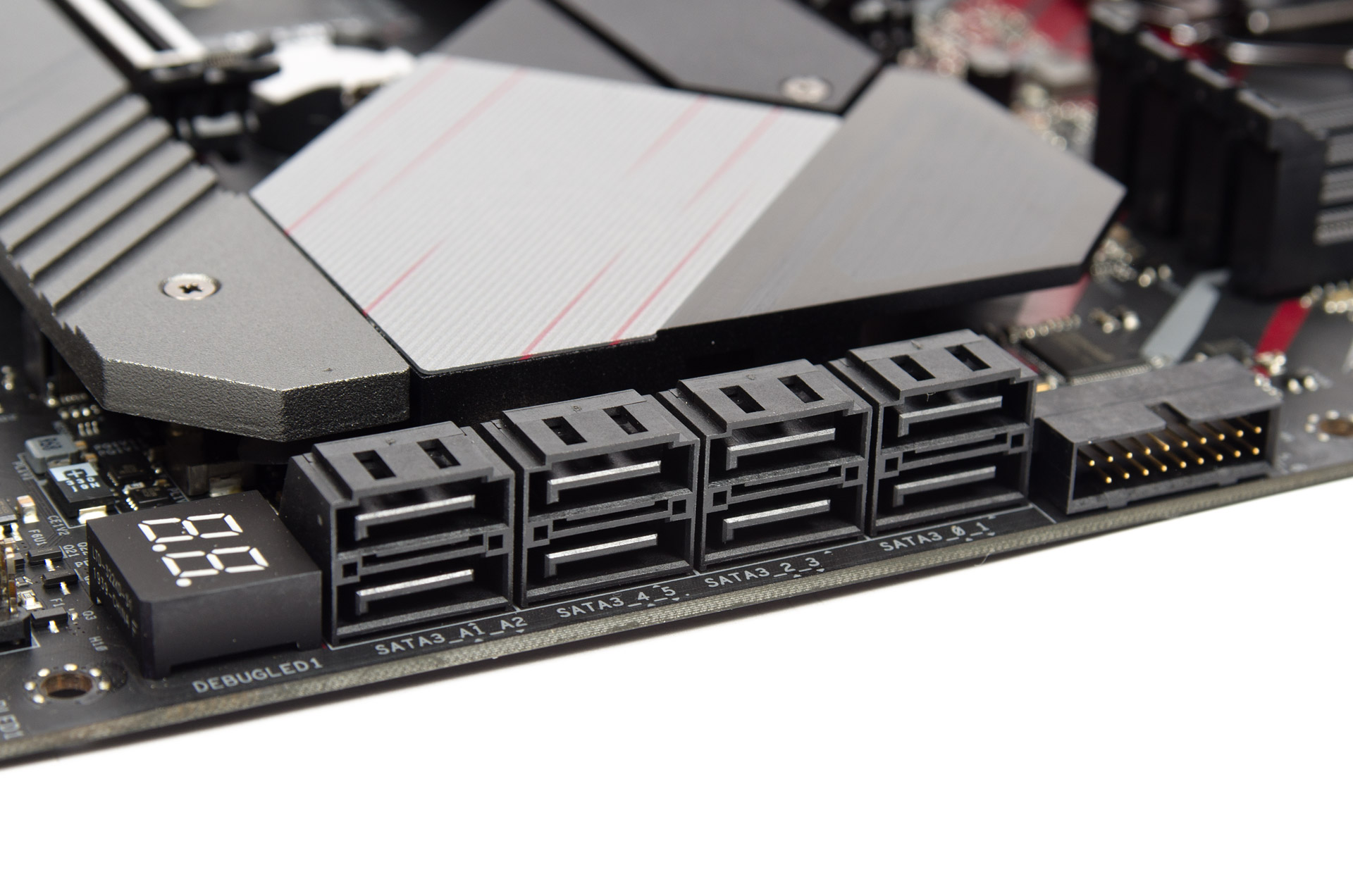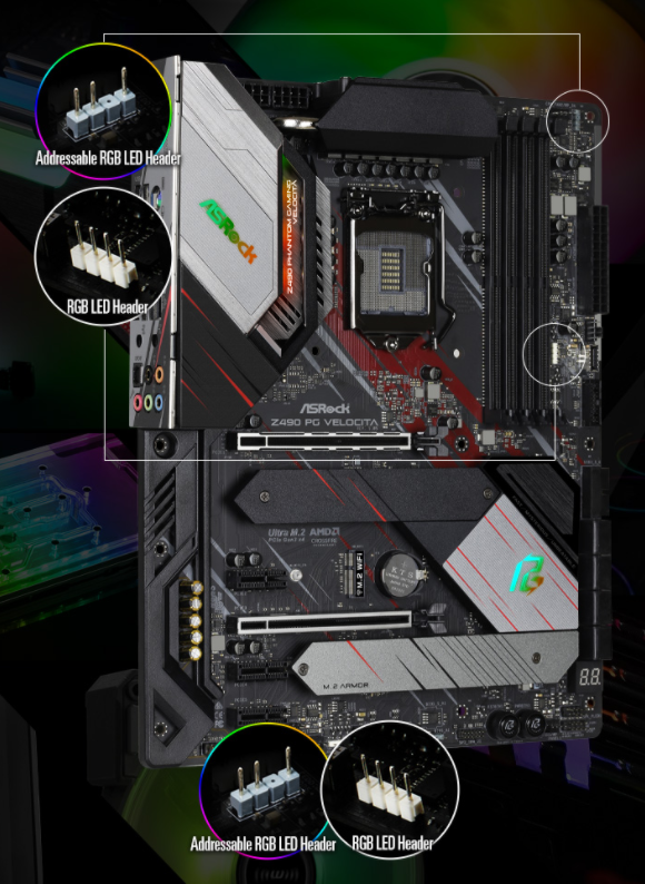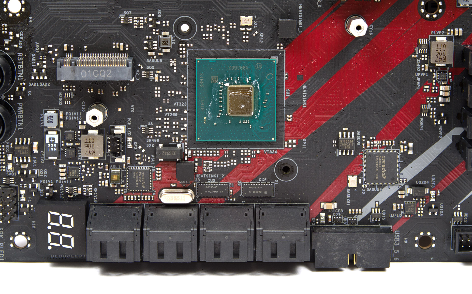 Пару штук можно увидеть около выходов SATA, про это мы уже вспоминали во вступлении. Здесь же можно заметить пару микросхем от ASMedia. Подсветка «реализована» гнездом на поверхности платы, светодиоды, выходит, встроены в сам охладитель Z490.