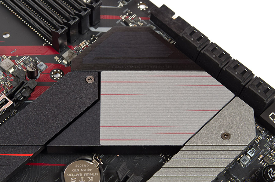 Охладитель чипсета сверху оснастили наклейками, через светлую впоследствии будет проникать светодиодное свечение.