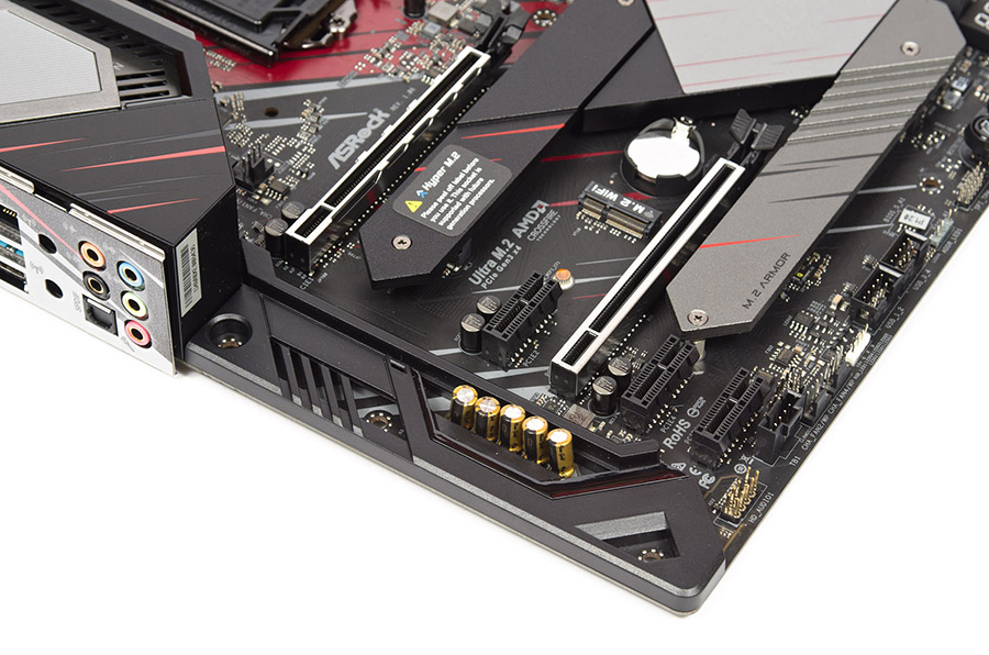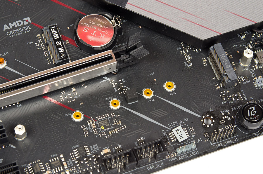 Во вступлении я уже рассказал про заготовленный, но пока бездействующий M2_1, напротив него находится M2_2, работающий с процессорами Comet Lake-S, поскольку сообщается с хабом. В любом случае, предельная длина устройства, смонтированного здесь, составит восемь сантиметров.
