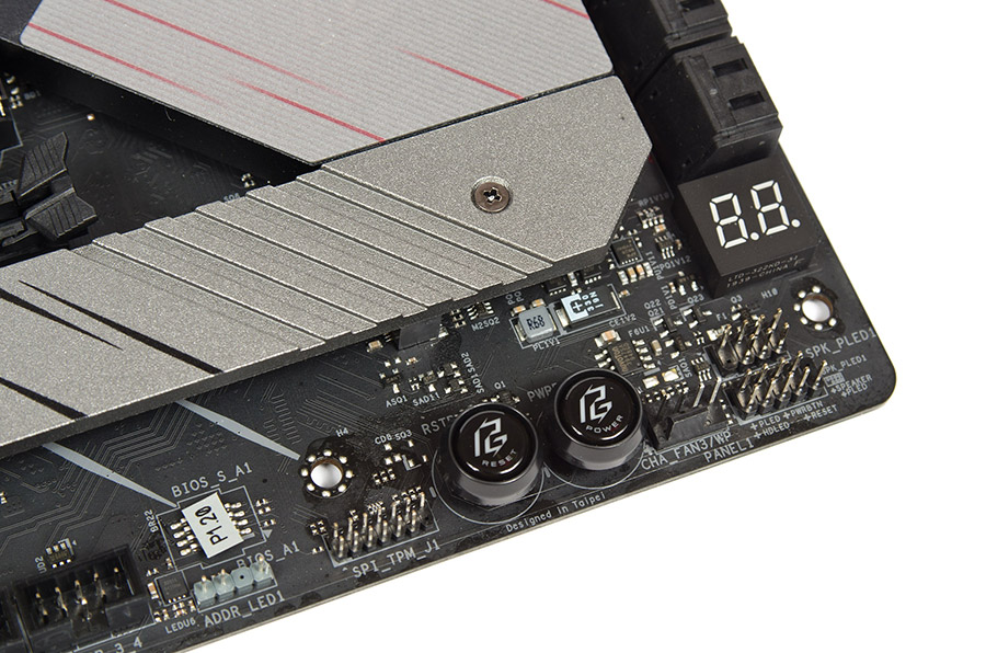 Обе наличествующие кнопки могут светиться красным, но изначально этого нет, изменить положение дел можно самому, через UEFI. Также там настраивается и режим работы индикатора кодов POST, имеющего тот же оттенок свечения. Он сможет, при желании, заняться отображением действующей температуры ЦП, уже после загрузки системы.