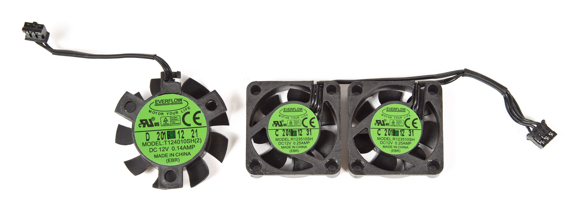 Выбрана продукция известного производителя — Everflow. Парочка поменьше сразу на заводе объединены удобным и недлинным общим кабелем, таходатчик заведён лишь с одной единицы, что логично в случае параллельного их подключения к одному гнезду на плате.