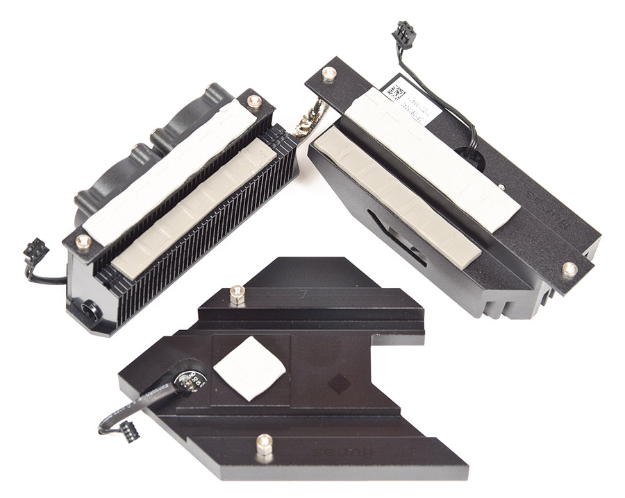 Тепловая трубка соединяет основной радиатор в виде литой болванки с дополнительным, набранным мелкими пластинами. Здесь трубка уходит вверх, не прогревая участок у основы. Видим четыре разнотипных прокладки, везде их площади достаточно для обеспечения прямых функций. Крепление всюду винтовое.
