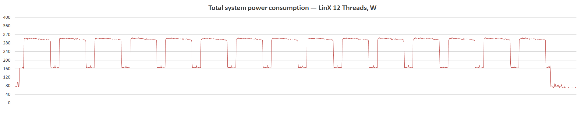 Рост и фиксация уровня всех без исключения напряжений привели к минимальным 69 Вт потребления, а в пике оно составило 307 Вт.