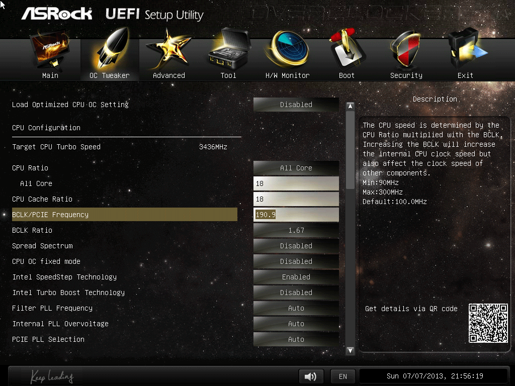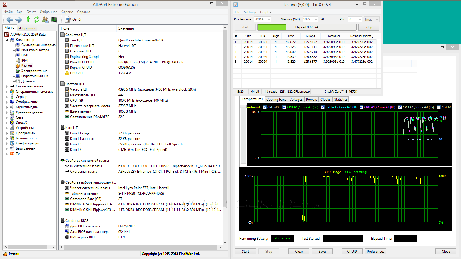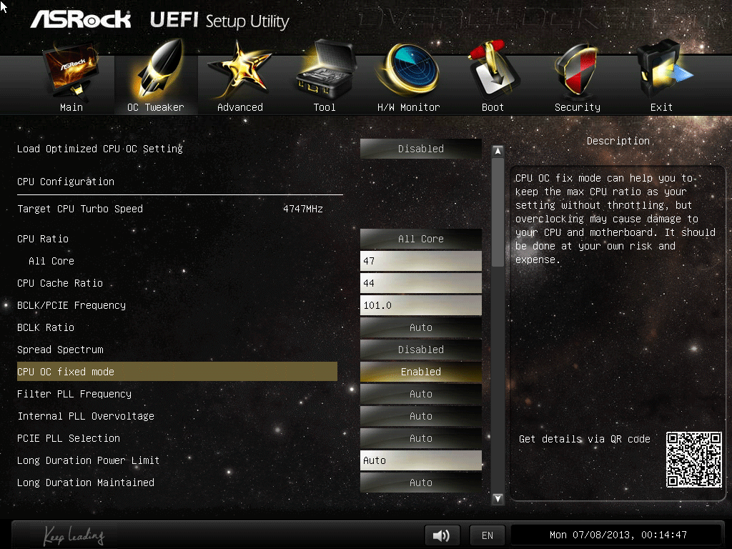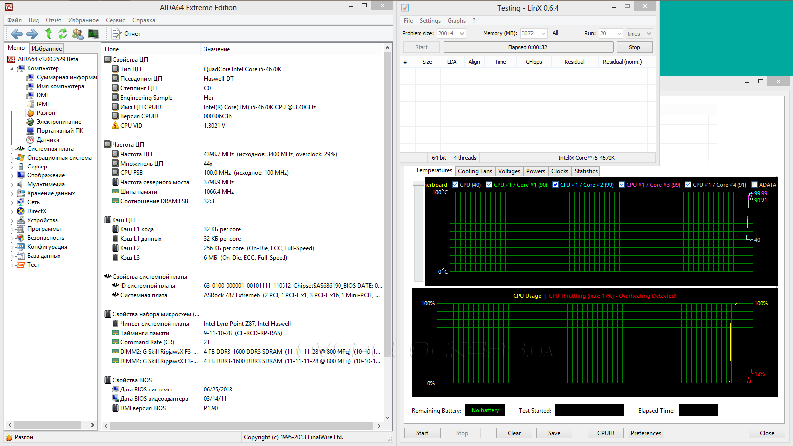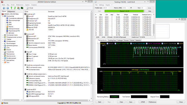 Этот раздел мы начнём с проверки готовых профилей Optimized CPU OC Settings — первого пункта подменю OC Tweaker в UEFI. Отталкиваясь от возможностей нашего стенда, 4,8 ГГц мы пропустили, поэтому первым будет пункт с подзаголовком в 4,6 ГГц. К сожалению, специалисты ASRock для такой частоты подобрали напряжение, превышающее 1,30 В, что для нашего экземпляра Core i5-4670K излишне. При таких настройках троттлинг включался практически мгновенно.