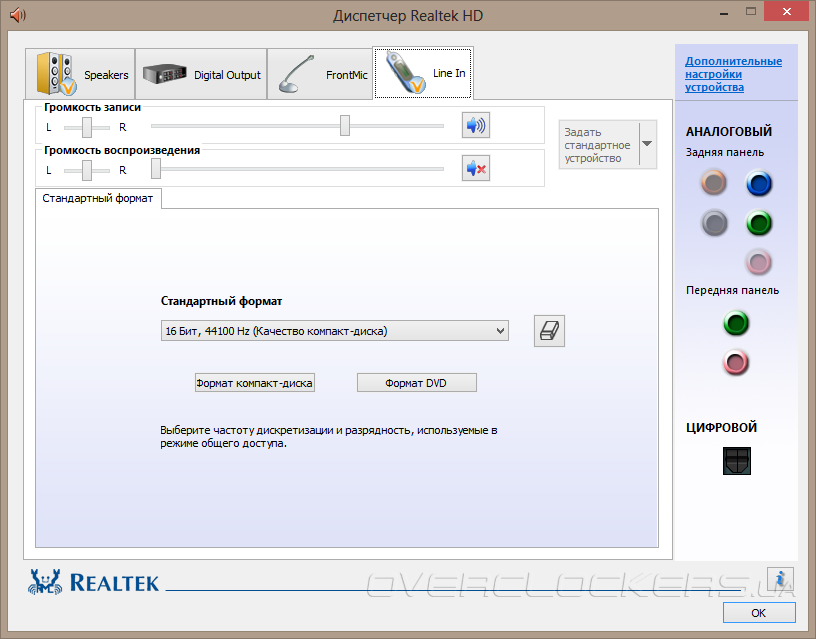 Перед каждым из циклов тестирования режим работы линейного выхода (ЦАП) согласовывался с режимом работы линейного входа (АЦП), то есть выставленному значению 16 бит 44,1 кГц на выходе соответствовало точно такое же значение на входе.