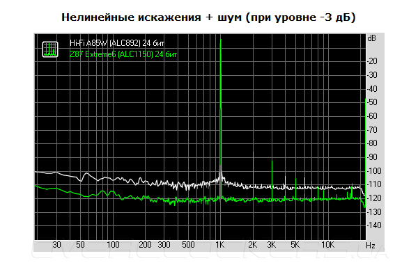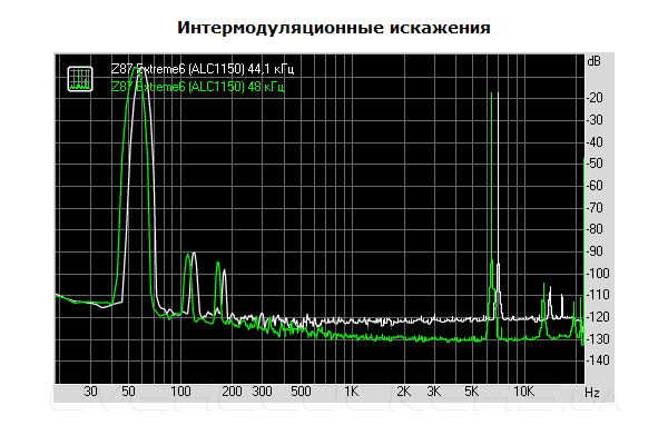Уровень шумов у ALC1150 значительно ниже, но реализация кодека на плате Z87 Extreme6 не идеальная, поскольку наблюдаются гармонические искажения, что проявляются с шагом в 1 кГц. Впрочем, их уровень не особо существенен.