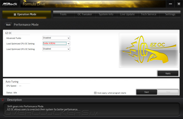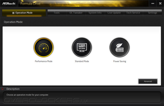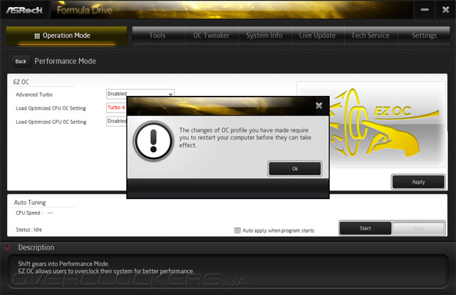 Не смотря на позиционирование платы как основного инструмента для самой просвященной в вопросах разгона публики, инженерами были предусмотрены несколько простых механизмов повышения итоговой производительности системы, помещённых в подраздел EZ OC. Они скрываются за кнопкой Advanced в головном разделе утилиты Formula Drive (предшественница на этом месте обладала кнопкой Auto Tuning). Итак, испробуем первый механизм — Advanced Turbo в самом мощном режиме 30 (видимо, речь идёт о некоей 3.0 версии).