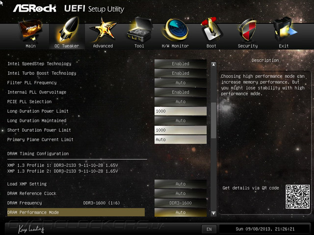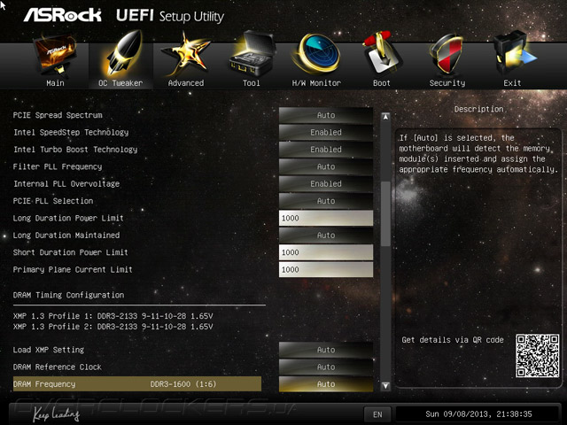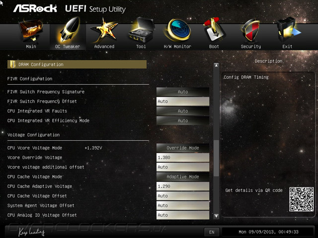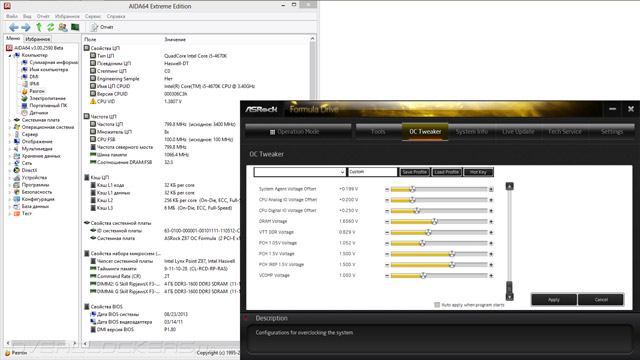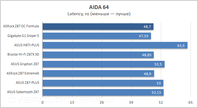 А вот с чем не сложилось так это с разгоном оперативной памяти. Мы столкнулись всё с теми же проблемами, что и в обзоре Z87 Extreme6. При выставлении проверенной формулы задержек 11-13-12-30-1T при частоте 2666 МГц Z87 OC Formula не могла пройти процедуру POST. Она всё же включалась, в отличии от более простой платы, выполнив несколько неудачных «заходов», с предложением о внесении изменений в настройки.