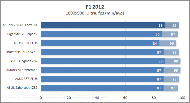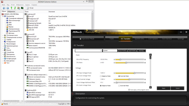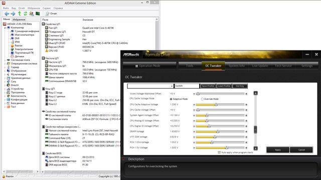 Z87 OC Formula представляет собой уникальный продукт, где впервые реализован подход защиты узлов и компонентов платы от пагубного воздействия жидкостей. Это ещё не означает, что вместе с платой можно ходить в душ, но несколько капель, попавших на неё из-за плохого крепления шлангов на штуцерах, не приведут к моментальному короткому замыканию. Но более вероятен другой сценарий — защита от конденсата при азотных бенч-сессиях. Ведь именно с уклоном для последних она и была спроектирована. Программно-аппаратный комплекс по разгону системы «в один клик» успешно прошёл испытания в сфере повышения множителя ЦП и его питающего напряжения. Есть и недостатки, над которыми, как мы можем судить, трудятся программисты, а найденные ошибки исправляются с выпуском улучшенных бета-версий фирменных утилит.