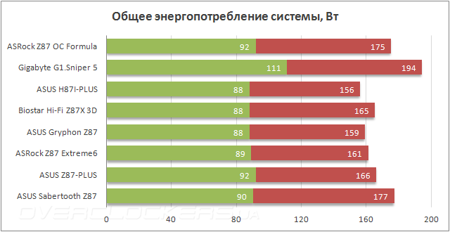 Замеры выполнялись после прохождения всех прочих тестов в «устоявшемся» режиме компьютера при помощи прибора Luxeon AVS-5A. Методика заключалась в фиксации средневзвешенного значения потребления тестового стенда «от розетки» во время прохождения теста Prime95 с применением профиля In-place large FFTs а также при простое компьютера после завершения теста.