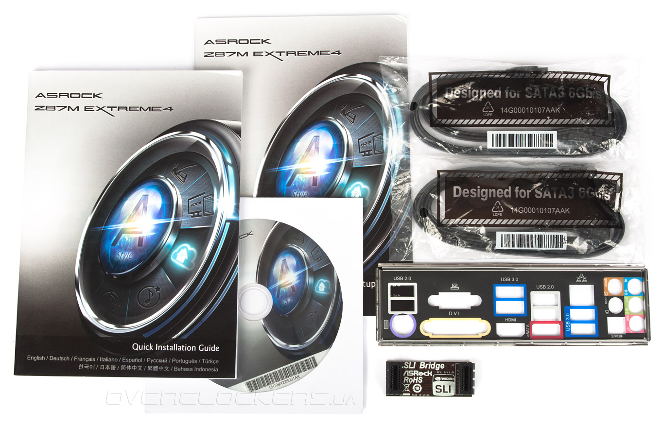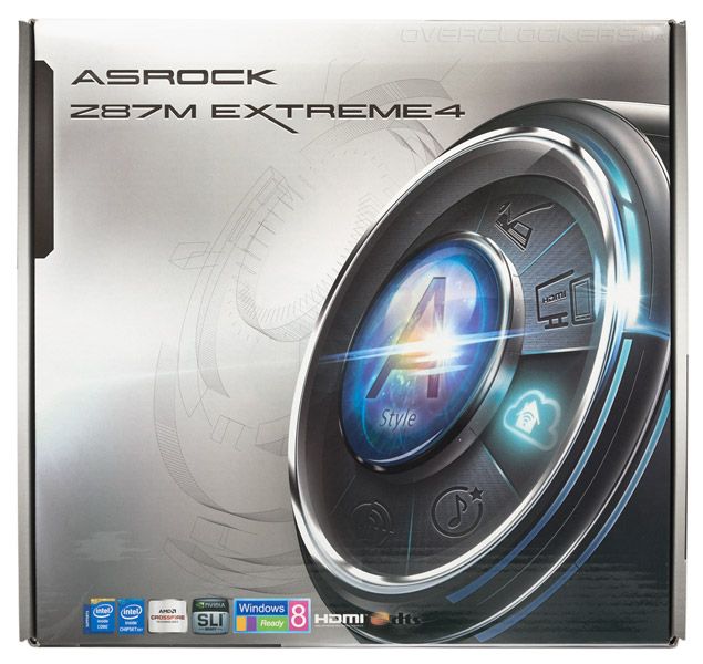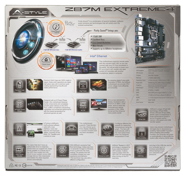 Все свои инновации компания ASRock свела в единый комплекс A-Style, который теперь занимает главное место в оформлении упаковки. Пиктограммы о поддержке CrossFireX и SLI подтверждают мысль о максимальном раскрытии функциональности Z87 у этого изделия.