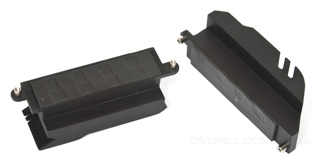 Радиаторы пусть и бесхитростные — не оснащённые тепловой трубкой, но их вес весьма солиден, и, значит, теплоёмкость должна быть неплохой. В качестве термоинтерфейса используется материал, похожий на резину, тёмного цвета и толщиной около полутора-двух миллиметров.