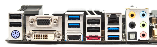 Задняя панель представляет собой классическую картину современного мультимедийного компьютера. Обильное количество разномастных видеовыходов и USB-портов — большего и желать не нужно. Ценители всё ещё могут использовать eSATA, а вот FireWire уже отошёл в историю. Оснащение HDMI-выхода помощником в виде конвертера ASM1442 (или подобным аналогом) становится уже де-факто стандартом.