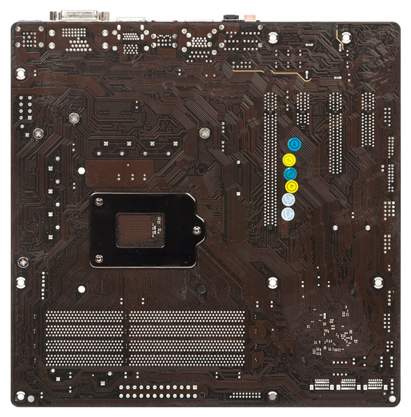 Обратная сторона не примечательна какими-то деталями. В зоне размещения усилительной пластины охладителя ЦП нет ничего лишнего.