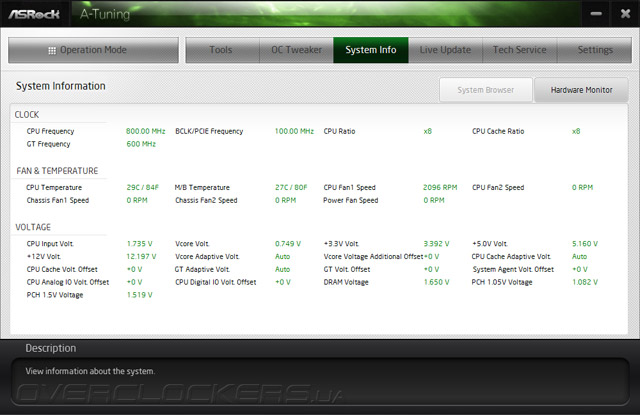 Следующая страница — OC Tweaker — преображается с каждым обновлением программного комплекса, и это не может не радовать. Если с выходом второй его версии мы смогли изменять параметры, не вызывая ошибки приложения, то теперь здесь появились недостающие параметры, о которых мы упоминали в обзоре Z87 Extreme6. Множитель CPU Uncore теперь доступен для изменения, а данные о частоте DRAM скрываются в правой «шторке». Одним словом, теперь это практически полноценный комплекс по настройке системы из ОС. (Правда не ясно, для чего было делать именно «шторку», ведь место занимаемое ею в развёрнутом виде ничем не занято).