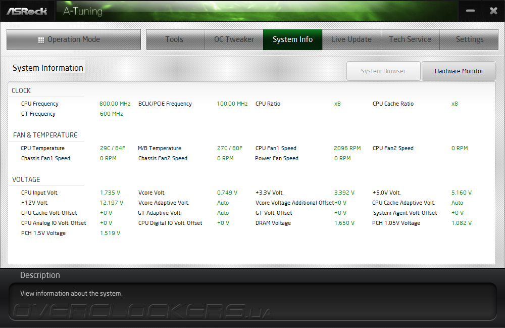 На странице System Info отображается максимально возможное количество информации, поступающей с различных узлов платы. Небольшие вопросы вызывает напряжение CPU Input, но в общем всё практически образцово.
