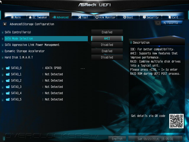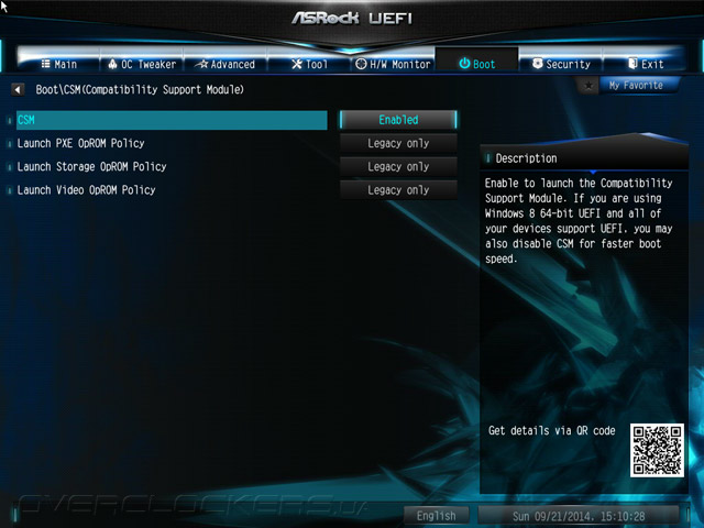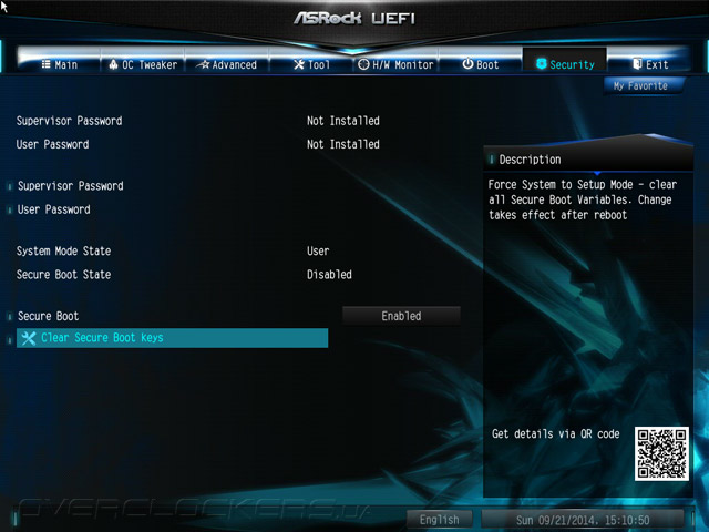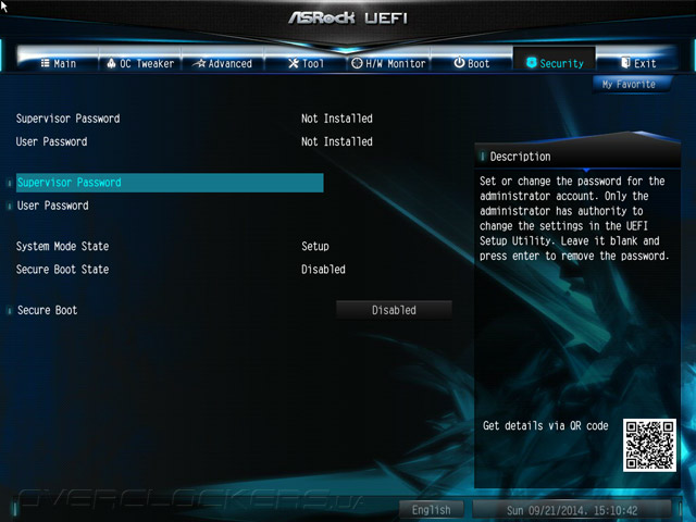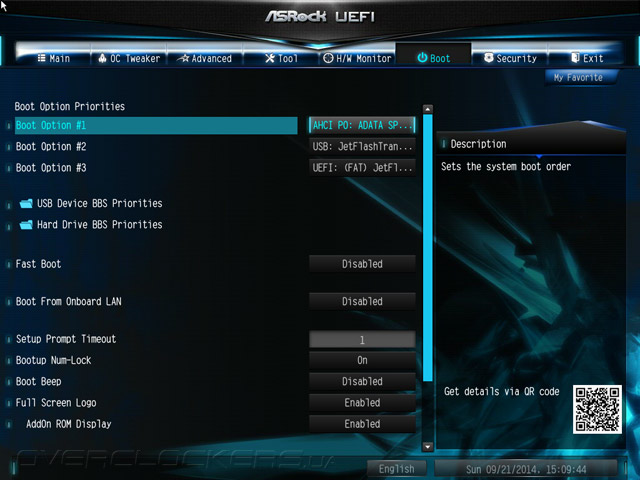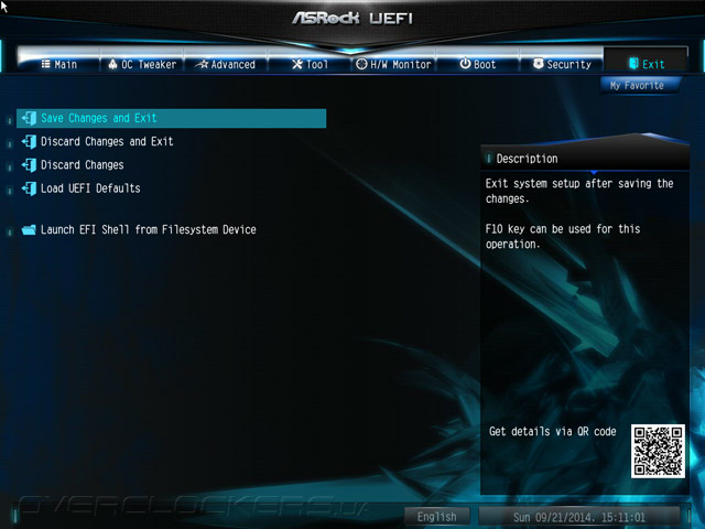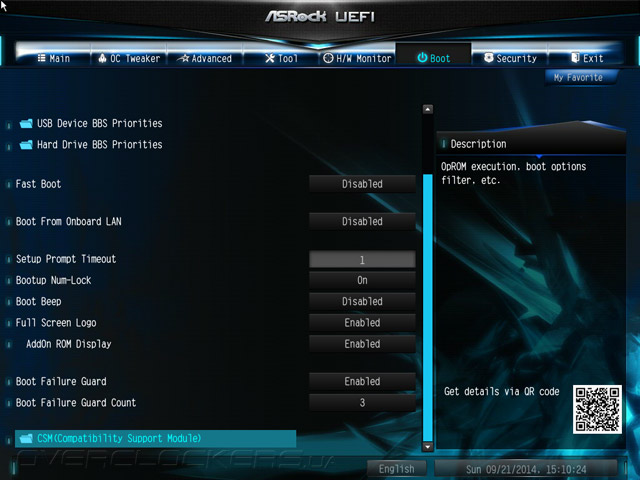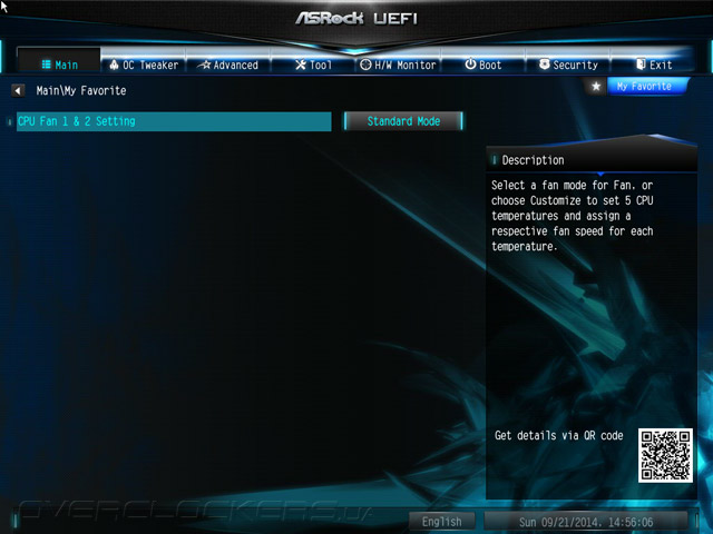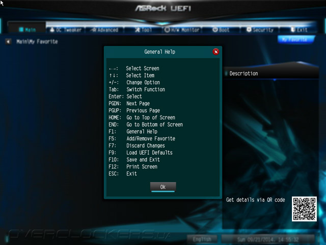 Структура меню UEFI абсолютно не изменилась, если проводить параллели с продуктами, чью основу составляли наборы системной логики прошлой, восьмидесятой серии. Добавился лишь пункт меню My Favorite. Для добавления и удаления закладки следует использовать клавишу F5. К тому же, этот раздел можно сделать стартовым наряду со всеми остальными, то есть таким, что автоматически будет открываться по входу в UEFI.