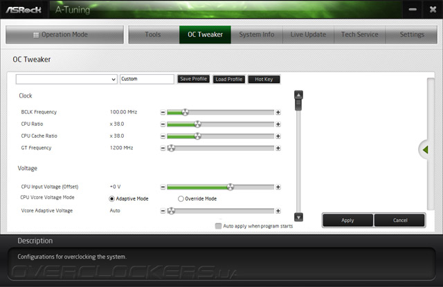 Наполнение OC Tweaker, к счастью, никак не пострадало из-за нижнеценового позиционирования модели. Здесь есть небольшие изменения. Слегка увеличенный шрифт придаёт удобства в работе, но главное — появились поля со значениями CPU Cache и Memory Speed. BCLK Frequency заменил ячейку со значением Ratio. В рубрике Voltage Configuration упростился способ управления напряжением PCH, сводимый теперь к выбору между Normal и High. Во всём остальном набор механизмов сопоставим с прежде рассмотренными представителями серии Extreme.