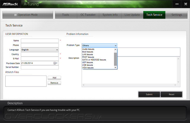Tech Service поможет оформить и тут же отправить заявку в фирменную техподдержку для разрешения возникших проблем. Собственные настройки у комплекса практически отсутствуют — есть лишь возможность установить и убрать его из автозагрузки.