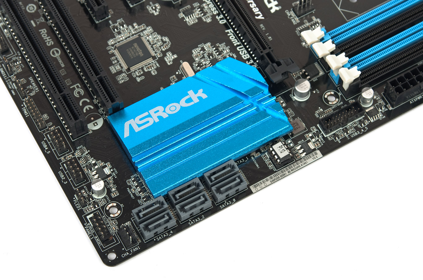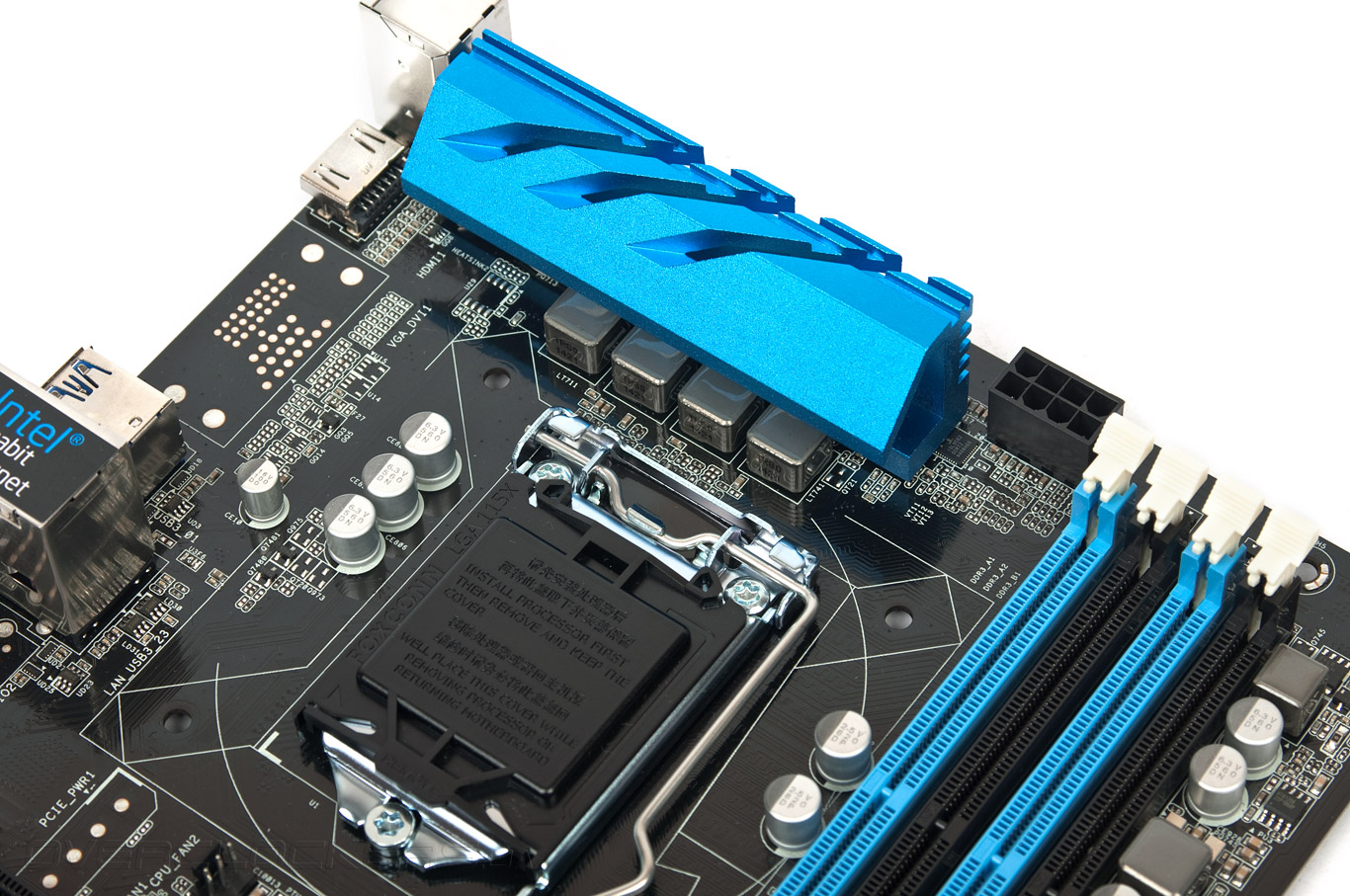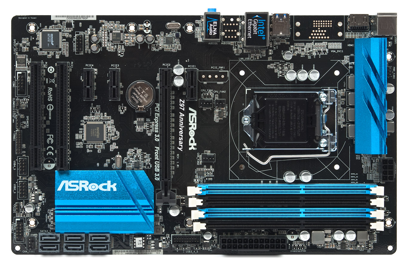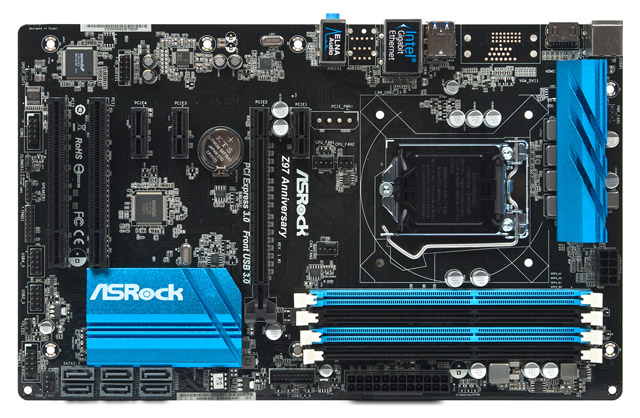 У искушенного пользователя вид Z97 Anniversary может вызвать культурный шок. Ширина изделия составляет всего 19 см, а всё из-за расположения элементов питания в верхней части PCB. Отмечу, не совсем очевидным в данном случае является вопрос расположения системы охлаждения ЦП: процедуре установки самого кулера на плату вряд ли что-то помешает, а вот с размещением всей конструкции внутри корпуса могут быть вопросы. Массивный радиатор будет практически полностью смещён к левому краю «материнки», то есть — и к стенке большинства корпусов, поэтому с креплением привычного там вентилятора придётся что-то придумывать.