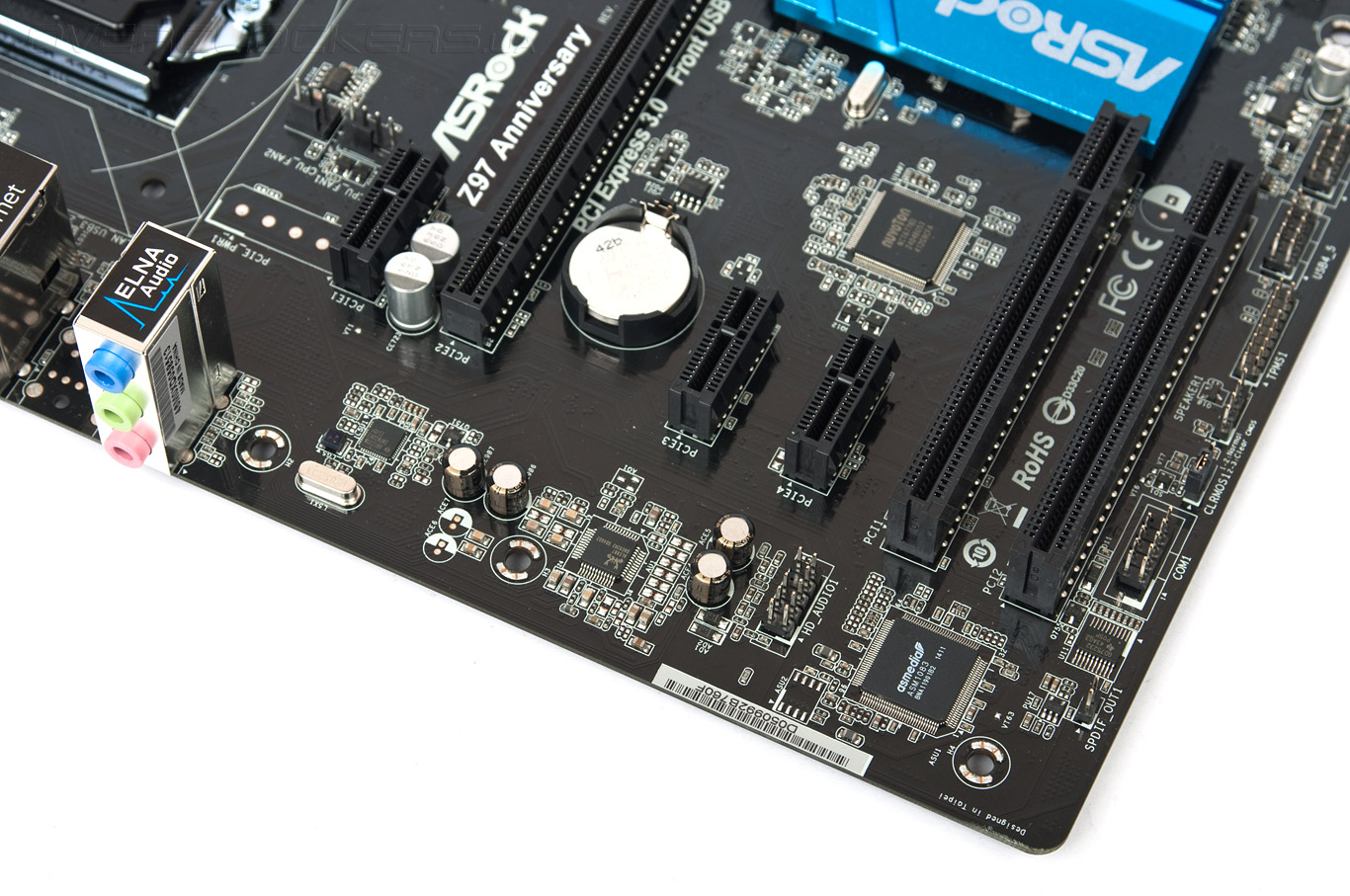 Звуковая подсистема не использует особых схем реализации и конструкторских изысков. Нет даже дешевого операционного усилителя по соседству с кодеком. Есть четыре японских конденсатора ELNA, очевидно, по паре на каждый из выходов — на задней и передней панели. Оттого места более чем достаточно. Его занял сетевой адаптер Intel, в обвязке которого используется катушка с закрытым типом корпуса (сторонний шум в режиме ожидания от платы не исходит). А ещё тут расположен мост PCI-E–PCI — ASM1083.