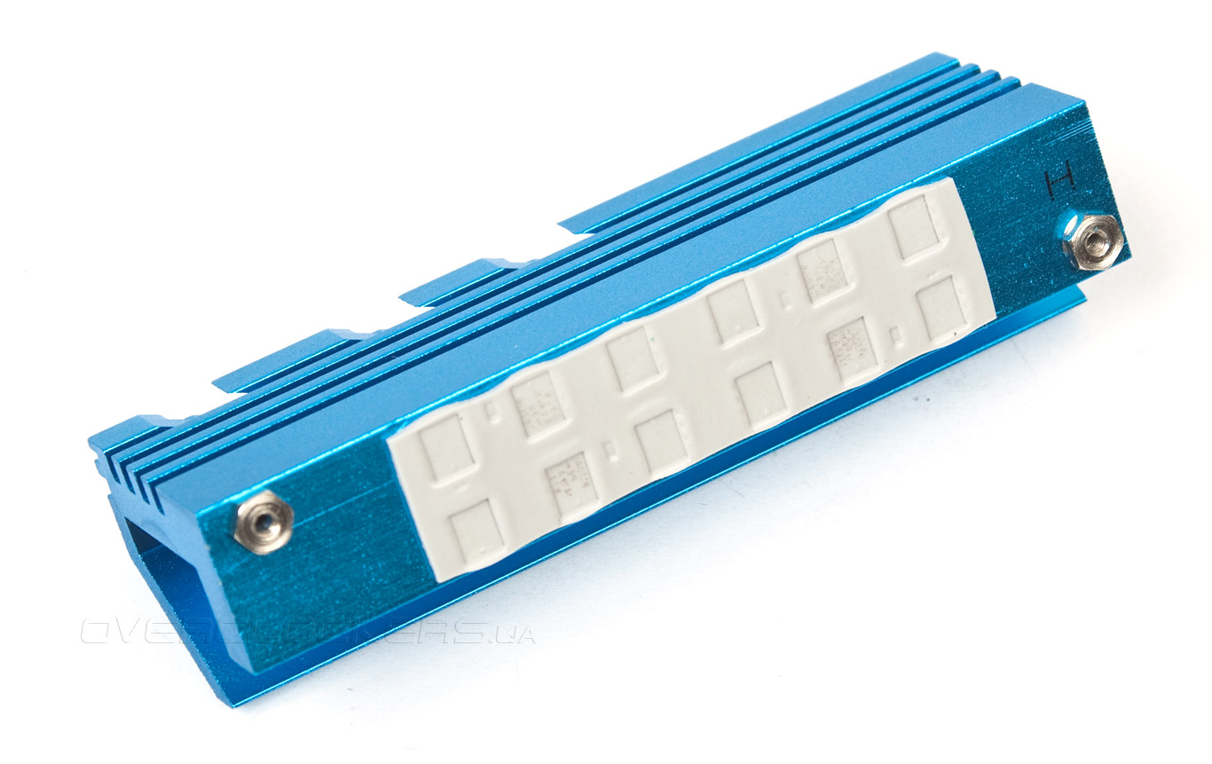 Радиатор особо вычурным не назвать, но общая площадь поверхности у него хорошая, к тому же есть несколько глубоких прорезей, увеличивающие это число. Его вес оказался весьма немалым, признаться, неожиданно, исходя из внешнего вида. Контакт с силовыми элементами хороший, полный и надёжный. Роль передающего тепло элемента привычно досталась термопрокладке резиноподобной субстанции толщиной около полутора миллиметров.