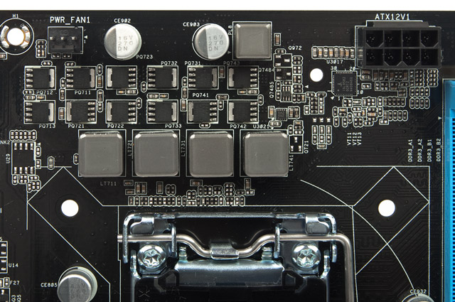 ШИМ-контроллер широко распространённый для продуктов средней ценовой категории, это ISL95820 от Intersil Corporation. Он позволяет реализовать схему четырёхканального стабилизатора, что и было достигнуто с привлечением двенадцати элементов. Их маркировка — 5830DL и 9130AL, они уже встречались в составе модели ASRock Fatal1ty B85 Killer, то есть являются представителями NXP Semiconductors. В тот раз подобная схема продемонстрировала не самое лучшее поведение, посмотрим, как будет в этот раз — скажется ли увеличенное до четырёх число каналов на качестве формируемого напряжения.