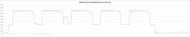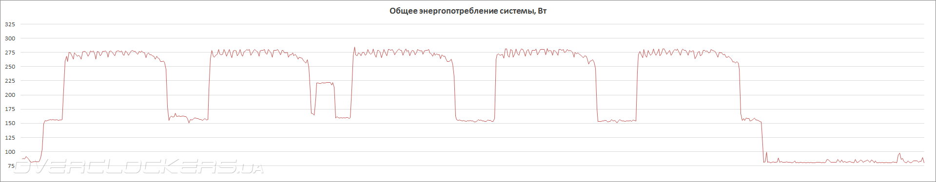 Замеры выполнялись после прохождения всех прочих тестов в «устоявшемся» режиме компьютера при помощи прибора собственной разработки. Методика заключалась в фиксации средневзвешенного значения потребления тестового стенда «от розетки» во время прохождения теста Prime95 с применением профиля In-place large FFTs а также при простое компьютера после завершения теста.