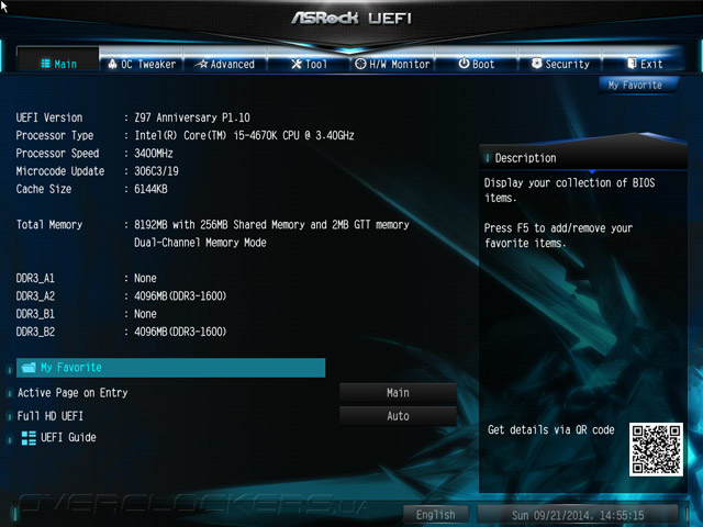 Структура меню UEFI абсолютно не изменилась, если проводить параллели с продуктами, чью основу составляли наборы системной логики прошлой, восьмидесятой серии. Добавился лишь пункт меню My Favorite. Для добавления и удаления закладки следует использовать клавишу F5. К тому же, этот раздел можно сделать стартовым наряду со всеми остальными, то есть таким, что автоматически будет открываться по входу в UEFI.